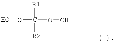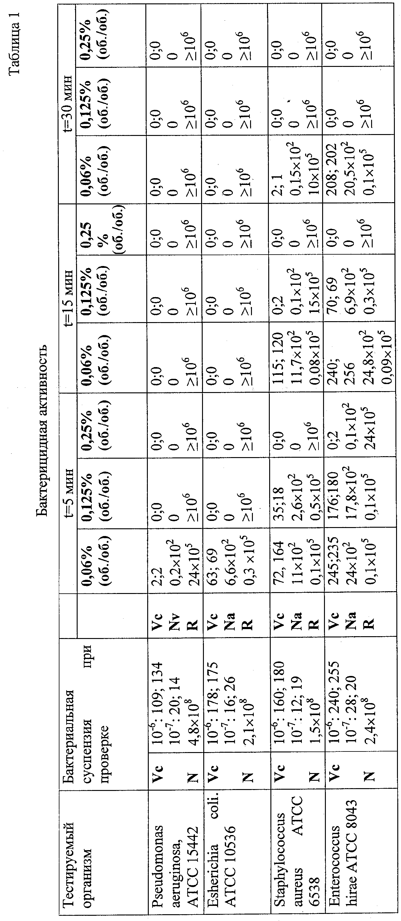 Примеры активности Пример 1 Бактерицидная активность Путем разведения Butanox M-50 (примерно 33% пероксида метилэтилкетона, вес./объем) в стерильной жесткой воде (300 мг/л СаСО3) было приготовлено три раствора пероксида метилэтилкетона с концентрациями 0,06%, 0,125% и 0,25% (объемные). Был добавлен нейтрализующий раствор тиогликолата в концентрации 0,5%, и таким путем было получено три прозрачных бесцветных раствора. Каждый из упомянутых выше растворов был приведен в контакт с различными штаммами бактерий на 5, 15 и 30 минут при температуре 20°С (Pseudomonas aeruginosa АТСС 15442, Esherichia coli. ATCC 10536, Staphylococcus aureus ATCC 6538, Enterococcus hirae ATCC 8043 и Legionella pneumophila ATCC 33152) и инкубирован при 20°С. Данные, полученные при проверке на достоверность, показаны в таблице I, a результаты бактерицидной активности каждого из трех растворов пероксида метилэтилкетона приведены в таблице 1.