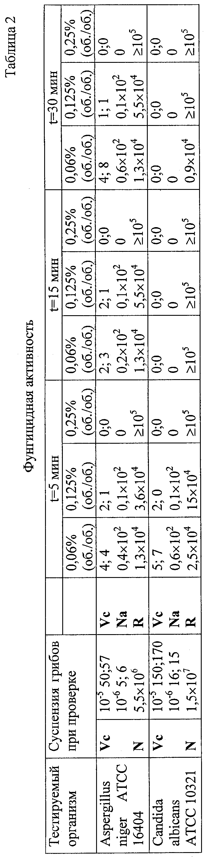 Vc: число жизнеспособных клеток; Nv: число к.о.е./мл в бактериальной суспензии; А: число к.о.е./мл в бактериальной суспензии при проверке на достоверность экспериментальных условий, используемых в этом методе (с мешающими веществами); В: число к.о.е./мл в бактериальной суспензии при проверке на достоверность токсичности нейтрализующего агента; С: число к.о.е./мл в бактериальной суспензии при проверке на достоверность метода разведения-нейтрализации. Vc: число жизнеспособных клеток; Nv: число к.о.е./мл в бактериальной суспензии; Na: число к.о.е./мл в смеси при проверке (<1,5×102 или >3×103 к.о.е./мл); R: снижение жизнеспособности (если бактерицидный эффект существует, R должно быть >105). Заключение Анализы, выполненные с продуктом этого изобретения в соответствии с нормой EN 1276 (1997) и разведениями 0,06%, 0,125% и 0,25% (объем/объем) в жесткой воде, демонстрируют, что названный продукт обладает бактерицидной активностью против Pseudomonas aeruginosa при обработке в течение 5, 15 и 30 мин в концентрации 0,06%, против Esherichia coli. при обработке в течение 5 мин в концентрации 0,125% и при обработке в течение 15 и 30 мин в концентрации 0,06%, против Staphylococcus aureus при обработке в течение 5 и 15 в концентрации 0,125% и в течение 30 минут при 0,06%, против Enterococcus hirae при обработке в течение 5 и 15 мин в концентрации 0,25% и в течение 30 минут при 0,125% и против Legionella pneumophila при обработке в течение 5 мин при 0,125% и в течение 15 и 30 минут при концентрации 0,06%. Пример 2 Фунгицидная активность Путем разведения Butanox M-50 (примерно 33% пероксида метилэтилкетона, вес./объем) в растворе хлорид натрия/триптон было приготовлено три раствора пероксида метилэтилкетона с концентрациями 0,06%, 0,125% и 0,25% (объемные). В качестве нейтрализующего агента был добавлен раствор тиогликолата в концентрации (0,5%). Каждый из упомянутых выше растворов был приведен в контакт с видами грибов Candida ablicans ATCC 10321 и Aspergillus niger ATCC 16404 на протяжении 5, 15 и 30 минут при температуре 20°С, и инкубацию проводили при 30°С. Данные, полученные при проверке на достоверность, показаны в таблице II, а результаты фунгицидной активности каждого из трех растворов пероксида метилэтилкетона приведены в таблице 2.