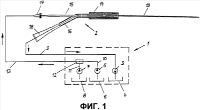 Вакуумный насос 3 соединен линией 9 откачки с хирургическим инструментом 2. Оба питающих насоса 5 и 7 содержат напорные линии соответственно 10 и 11, которые входят в переключаемый распределитель 12. Этот распределитель 12 предусмотрен для альтернативного использования одного из двух питающих насосов 5,7 и со стороны пользователя соединен напорной питающей линией 13 с хирургическим инструментом 2.