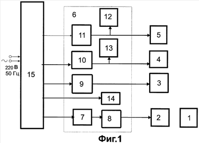 ПЧТ 7 и блок 15 питающих напряжений размещены в отдельном корпусе 27. На внешней поверхности корпуса 27 размещены регуляторы 18,19 частоты тока, индикатор 22 частоты тока, индикатор 12 температуры, регулятор 11 температуры, переключатели 9 и 10, переключатели 10 оптических излучателей, индикатор 13 и переключатели 8 режимов работы.