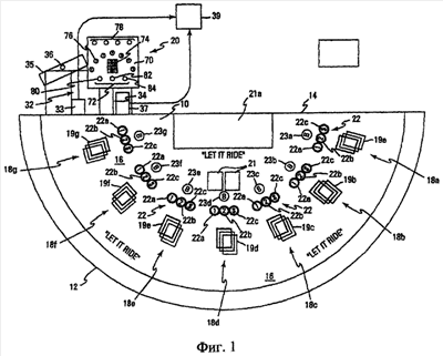 На Фиг.1 представлена система по настоящему изобретению для игорного стола, за которым происходит реальная карточная игра. Эта система по настоящему изобретению может быть применена к любому из следующих обычных игорных столов: баккара и вариантов, таких, как Grand Baccarat, Mini Baccarat, Midi Baccarat, Chemin de fer и Puncto Banco; блэкджек и вариантов, таких как Progressive Twenty One, Triple Action Blackjack, Super Seven’s Блэкджек, Spanish Twenty One, Vingt et un и Pontoon; Big Wheel, Big Six и варианты. Craps и варианты. In Between и варианты, такие как Red Dog и Catch-A-Wave; Poker и варианты, такие как покер Caribbean Stud®, покер Caribbean Draw, покер Let It Ride®, Tres Card Poker, Pai Gow Poker, и Wheel и Deal; Roulette и варианты, такие как American Roulette (американская рулетка), Тпгее Card Poker (покер с тремя картами), French Roulette (французская рулетка). Single Zero Roulette (рулетка с одним зеро) и Twin Roulette; и Sick Во. Форма, тип и вариант игры у стола 20 неважны для описания по настоящему изобретению и не ограничиваются описанием, приведенным здесь. Игорный стол 10, в одном общем примерном варианте исполнения, приспособлен для покера Let It Ride Bonus®, и на Фиг.1 показаны семь позиций игроков с 18а по 18g. В каждом положении игроков находится положение карт с 19а по 19g, соответственно, и три отдельных положения для ставок игроков 22а, 22b и 22 с. Положения группового пари (например, банка или бонуса) по сделанным ставкам с 23а по 23g показано у положения каждого игрока. Положение для карт сдающего 21 показано перед положением сдающего 20.