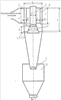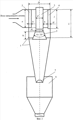 1. Пылеуловитель мелкодисперсной пыли, содержащий цилиндрический корпус, нижняя часть которого выполнена конусной, тангенциальный вход в виде плоского щелевого канала, уступы, выполненные по образующей внутренней поверхности корпуса, обечайку, выходной патрубок, отличающийся тем, что обечайка расположена в области соединения цилиндрической и конической частей корпуса и выполнена в виде усеченного конуса с центральным углом 6-10°, диаметр верхнего основания которого на 10% превышает диаметр выходного патрубка, а уступы выполнены в виде пластин, длинная сторона которых прикреплена к образующей внутренней поверхности цилиндрической части корпуса, а другая сторона является срезом уступов, причем длина уступов соотносится с длиной образующей внутренней поверхности цилиндрической части корпуса как l=(3/5÷2/3)L, где l – длина уступа, которая в предельном случае равна высоте плоского щелевого канала тангенциального входа, т.е. l= ; L – длина образующей внутренней поверхности цилиндрической части корпуса; – высота плоского щелевого канала.