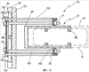 В этом варианте в отличие от показанного на фиг.8 и 9 варианта позиция 162 обработки выполнена, например, в виде сушилки или сушильной камеры для горячей сушки лакокрасочных покрытий, наносимых методом катодного электроосаждения, и через которую перемещаются прямо стоящие детали 42. В процессе обработки детали 42, таким образом, удерживаются на поворотной раме 97 с их нижней стороны. Рабочее пространство сушилки 162 ограничено корпусом 164, в дне 165 которого имеется продольная прорезь 166, позволяющая перемещать прямо стоящие детали 42 в корпусе 164. Как показано на фиг.11, с входной стороны корпуса 164 в его дне 165 предусмотрено входное отверстие 168, через которое закрепленную на несущем элементе 36 деталь 42 можно путем поворота соответствующего поворотного приспособления поместить снизу в рабочее пространство сушилки и установить в нем в стоячее положение. За этим входным отверстием в корпусе следуют, например, три участка обработки, обозначенные на чертеже прерывистыми линиями. С выходной стороны сушилки 162 соответственно предусмотрено выходное отверстие 170, через которое закрепленную на несущем элементе 36 деталь 42 можно путем поворота вниз соответствующего поворотного приспособления вновь вывести из рабочего пространства сушилки.