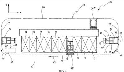 Для перемещения несущих элементов 36 используется обозначенный общей позицией 22 транспортер, который выполнен в виде кругового транспортера, связанные с которым несущие элементы 36 могут приводиться в движение общим приводом тягового (шлепперного) типа или же каждый из них может быть снабжен индивидуальным приводом и перемещаться им отдельно от других несущих элементов. Транспортер 22 имеет проходящий в первом направлении (направлении х) вдоль торцовых сторон ванн 12-21 рабочий участок 24, проходящий параллельно рабочему участку 24 на удалении от него обратный участок 26 для возврата несущих элементов в начало рабочего участка, первый концевой участок 28 и второй концевой участок 30. На первом концевом участке 28 несущий элемент 36 вместе с имеющимся у него держателем 40 находится на приемной позиции, на которой обрабатываемые детали 42 могут подводиться к нему с предшествующей технологической позиции в первом направлении (направлении х) по стрелке 43 и фиксироваться в держателе 40.