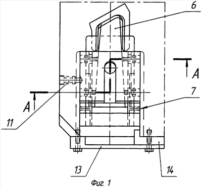При раскрытии пресс-формы по разъему наклонный штырь 1 выводит клин 6 из отливки вниз, при этом наклонная поверхность клина 6 отходит от наклонных поверхностей стержней 3, позволяя упругим элементам 10 отжать стержни 3 от поверхности ползуна 5 в направлении, перпендикулярном оси ползуна 5, тем самым выводя их из оформленных поднутрений отливки. После выведения стержней 3 из поднутрений клин 6 под воздействием наклонного штыря 1 по пазам 8 продолжает движение вниз до упоров, после чего приходит в движение ползун 5 со стержнями 3. При этом ползун 5 отжимает подпружиненный фиксатор 11 и перемещается вниз по Т-образным пазам подвижной полуформы 4, выводя стержни 3 из отливки. В конце хода клин 6 упирается в опорную планку 13, а ползун 5 – в упор 14.