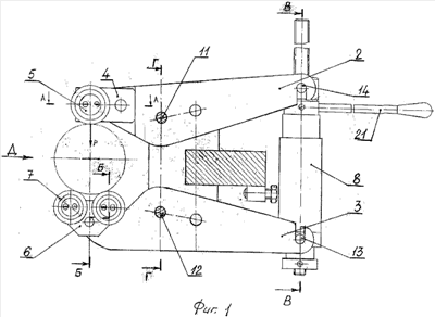В поворотных двухплечих рычагах 2 и 3 выполнены отверстия для крепления обкатных головок 4 и 6 осями 9 и 10 в соответствии с фиг.3 и 4 и отверстия под установку осей 11 и 12 (фиг.6) для крепления двухплечих рычагов 2 и 3 в корпусе 1 с возможностью поворота, а также пазы для установки механизма регулирования усилия обкатки 8 ответными цапфами 13 и 14 к двухплечим рычагам 2 и 3.