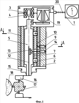Индуктивный преобразователь 2 и электромагнитный исполнительный механизм соединены кабелем 20 с узлом отсчета 1. Преобразователь герметизирован.