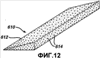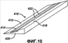 Со ссылкой теперь на Фиг.10-12, в некоторых воплощениях композиция вспомогательного средства для бритья может быть в целом в форме клина. Клин может быть прикреплен к бритвенному картриджу посредством, например, склеивания. На Фиг.10 клинообразная композиция вспомогательного средства для бритья 410 включает вытянутые в длину части 412, 414 и 418, каждая из которых включает вытянутую в длину экспонированную поверхность. Композиция вспомогательного средства для бритья 410 также включает соединительную часть 420. Части 412, 414 и 414 могут каждая включать основу вспомогательного средства для бритья (т.е. нерастворимый в воде полимер и вспомогательное средство для бритья). Основа вспомогательного средства для бритья в каждой части может отличаться от основ в других частях или может быть такой же. На Фиг.10 часть 414 включает отшелушивающие элементы 422.