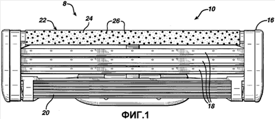 Показанная на фиг.1 система 8 для влажного бритья включает заменяемый бреющий картридж 10 типа, описанного в патенте США №5787586, права на которую переданы тому же заявителю, как в представленной заявке, и, таким образом, включенного в данное описание посредством ссылки. В то время как система 8 для влажного бритья по фиг.1 включает заменяемый картридж, в некоторых воплощениях она может включать бреющую головку, которая является объединенной с ручкой бритвы, так что цельная бритва утилизируется, когда лезвие или лезвия становятся затупленными.