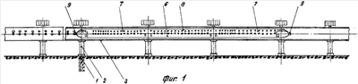 Сверхзвуковая наземно-транспортная система содержит свайное основание с ростверком 1, вертикальные, преимущественно железобетонные споры 2, установленные на них сверху на высоте 10-12 метров двухслойные трубы 3 с кольцевыми 4, продольными жесткостями 5, причем на кольцевых жесткостях, равноудаленно между продольными жесткостями выполнены отверстия (на чертеже не показаны). Транспортное средство 6, расположенное внутри вакуумной направляющей трубы 3, содержит н-ное число отсеков главных и второстепенных. К главным относятся те, которые между собой соединены герметично сильфонами и назовем их отсеки вагонные 7 или, наоборот, вагонные отсеки. Внутри такого отсека длиной 100-120 или 150 м могут быть свой отсеки, например для малолетних детей, больных, стариков. Средний отсек 8 имеет два сильфона, обеспечивающих герметичность. Транспортное устройство-средство висит на магнитной подушке ни с чем не контактируя ни снизу, ни с боковых сторон, ни сверху. На концевых отсеках транспортного средства, на обтекаемо оформленных эстетичных торцах /хотя в безвоздушном пространстве форма для скорости движения не имеет значения/ на вертикальной оси симметрии прикреплены жидкостные реактивные двигатели 9. Емкости для горючего, окислителя и приводных механизмов реактивного двигателя оборудованы специальным усиленным отсеком, пульт управления двигателем выведен в штурманскую кабину как и все оборудование транспортного средства.