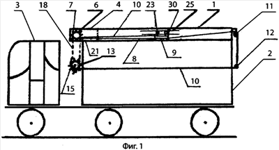 Верхние части продольных вертикальных стенок каркаса 19 (фиг.2) загнуты внутрь под прямым углом, образуя горизонтальную полку каркаса 20 (фиг.2 и 3). В передней части каркаса 1 со стороны кабины 3 (фиг.1 и 3) на уровне верха кузова 2 установлена нижняя полка 21, которая вместе с загнутой верхней частью торцевой и боковыми стенками каркаса 1 образует короб 4, размеры которого соответствуют размерам барабана тента 6 и каретки 9. Каретка 9 (фиг.1 и 2) имеет рамную конструкцию, к которой присоединены троса 10. На валу 22 каретки 9 установлены колеса 23 по два с каждой стороны на подшипниках 24. Колеса 23 размещены на направляющих 25 (фиг.2 и 3), установленных попарно со стороны верха и низа колес 23 на продольных стенках каркаса 1. Направляющие 25 прикреплены к стенкам каркаса 1 с помощью кронштейнов 26. Форма поверхностей качения колес и направляющих выбираются таким образом, чтобы обеспечить их надежное взаимодействие.