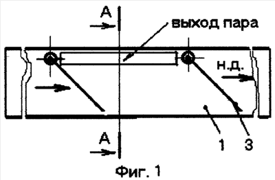 Ближайшим прототипом, который я знаю и привел ранее в заявке 15.06.06 «Движитель водореактивный паровой прямоточный», но литературы не нашел, является игрушка в виде модели катера с движителем, основанном на использовании взрывного характера парообразования для ускорения реактивного эффекта движения рабочего тела и состоявшем из квадратного, 20×20 мм, котла высотой 4 мм с верхней гранью-мембраной, двумя трубками-водоводами, диаметром около 4-х мм в нижней грани-днище, направленными к корме. Предварительно заполненный водой и подогреваемый снизу движитель довольно энергично перемещал кораблик. Недостатком устройства было быстрое, усталостное разрушение мембраны и превращение в пар всего объема жидкости в зоне подогрева (чем страдает и устройство по вышеприведенной заявке), поскольку площадь проходного сечения котла должна быть не менее сечения водовода, что снижало эффективность устройства.