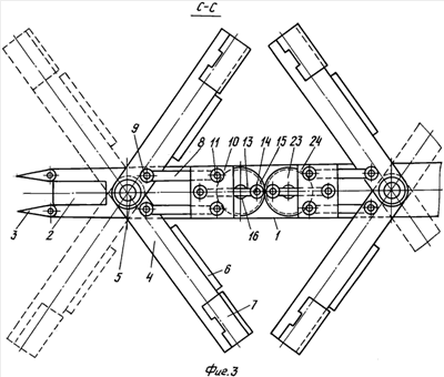 На фиг.3 – то же, вид С-С (без верхнего покрытия и без цилиндров с поршнями и штоками).