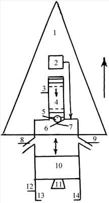 В то же время поршень 10, в связи с работой реактивного двигателя 11, перестает двигаться в обратную сторону и начинает двигаться к амортизатору 6.