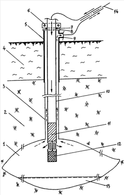 В Калининградской области геофизическими и геологическими исследованиями выявлена локальная изолированная полость в прочных слабопроницаемых породах. Для захоронения бытовых стоков г.Пионерска предусмотрено бурение одной скважины диаметром 350 мм с установкой кондуктора длиной 75 м в рыхлых отложениях и оборудованием ее трубным ставом диаметром 250 мм до глубины 270 м с лопастной гидравлической машиной (артезианский погружной насос типа АП) и электрогенератором в нижней части. Каждый килограмм (m=1 кг) жидких стоков по отношению к верхней границе полости (Н=265 м) обладает потенциальной энергией Р=mgH=1·9,81·265=2,6 кДж, (g – ускорение свободного падения, м/с2), которая с учетом гидравлических и механических потерь превращается в кинетическую энергию вращения вала насоса, примерно равную 1,6 кДж (при коэффициенте потерь = 0,5), и в электрическую энергию в генераторе, что соответствует 1,6 кВт мощности, которая отводится по кабелю и используется. Газообразные продукты биологического распада бытовых стоков отводятся по затрубному пространству скважины, кондуктору, патрубку и по трубопроводу вдоль трассы подаются к котельной, где сжигаются.