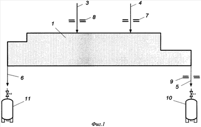 На блок-схеме фиг.1 показаны поток 3 внешнего питания каскада гексафторидом первичных отвалов обогащения натурального урана, поток 4 внешнего питания каскада гексафторидом первичных отвалов обогащения урана, выделенного из облученного металлического натурального уранового топлива, поток 5 отбора в отборной части каскада – НОУ-разбавитель, поток 6 отбора в отвальной части каскада – отвал обогащения обедненного урана (вторичный отвал обогащения). Кроме того, на блок-схеме показано место установки критических шайб 7, 8 и Р для создания требуемого отношения массового расхода потоков 3, 4 и 5. Позиции 10 и 11 – контейнеры, предназначенные для затаривания гексафторида НОУ-разбавителя и гексафторида вторичных отвалов обогащения соответственно.