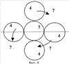 При размещении диспергаторов 4 по периметру круга, над плоскостью которого аксиально размещена форсунка 5, как показано на фиг.3, обеспечивается повышение производительности установки, повышается ее КПД. При этом показаны различные возможности ориентации струй, направляемых к поверхности диспергатора, как показано на фиг.4 и 5 (тангенциально либо радиально).