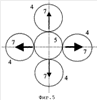 Фиг.4. Размещение форсунки над системой диспергаторов (вид сверху). Тангенциальная компонента скорости струй форсунки у поверхности системы диспергаторов (по п.11 формулы).