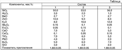 Изобретение относится к области технологии силикатов, в частности к составам стекла, которое может быть использовано для изготовления световых рассеивателей, изделий декоративно-художественного назначения, посуды. Известно стекло, включающее SiO2, Al2O3, K2O, CaO, CeO2, B2O3 и другие компоненты /1/. Известно стекло, содержащее, мас.%: SiO2 62,06-63,77; BaO 1,0-1,5; ZnO 10,0-12,0; Na2O 6,0-10,0; K2O 6,0-12,0; Sb2O3 0,5-2,0; Er2O3 0,03-0,04; CaO 6,0-8,0; Al2O3 0,5-1,0; компонент из группы TiO2, CeO2 0,5-1,2 /2/. Цель изобретения – повышение показателя преломления стекла. Цель достигается тем, что в состав стекла дополнительно вводят PbO, B2O3, SrO при следующем соотношении компонентов, мас.%: SiO2 50,0-56,0; Al2O3 1,0-3,0; BaO 1,7-2,7; ZnO 8,0-10,0; K2O 8,0-12,0; Sb2O3 0,05-0,15; Er2O3 0,05-0,15; CaO 5,0-7,0; CeO2 0,05-0,15; TiO2 5,0-7,0; PbO 2,0-4,0; B2O3 5,0-7,0; SrO 2,0-3,0. В таблице приведены составы стекла. Источники информации 1. Патент Франции №2546159, С03С 3/08, 1984. 2. Авторское свидетельство СССР №1143703, С03С 3/087, 1985.