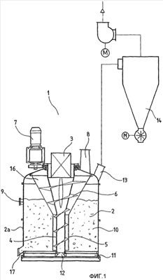 15. Установка по п.14, отличающаяся тем, что подающий винт приводится во вращение, по меньшей мере, двумя центрирующими рычагами, объединенными с мешалкой.
