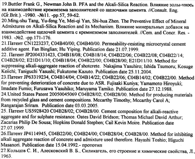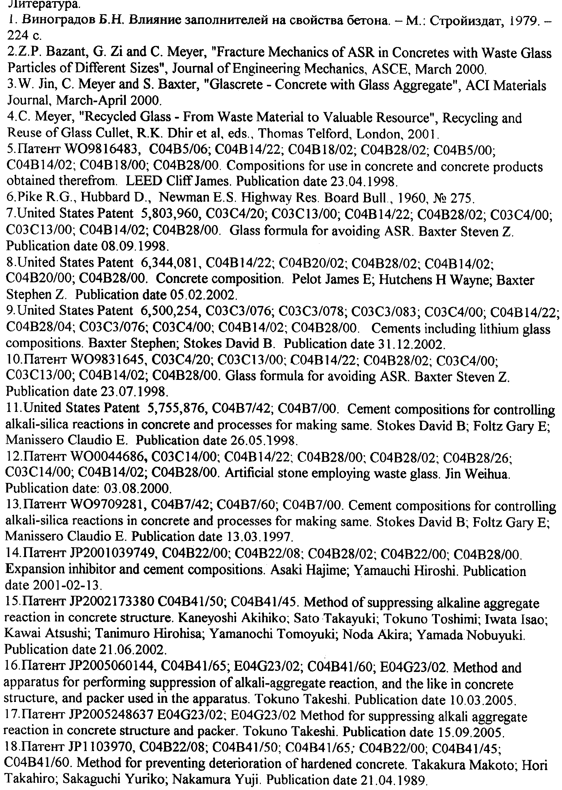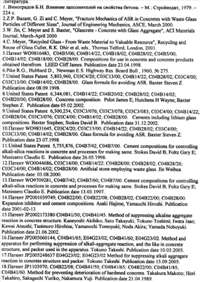 Область техники Изобретение относится к производству бетона, содержащего в своем составе стеклобой и ингибитор коррозии бетона, способствующий подавлению процессов расширения бетона в результате протекания реакции между щелочами бетона и кремнеземом наполнителя. Уровень техники Бетон – это искусственный камень, состоящий из четырех основных компонентов: воды, цемента, мелких и крупных заполнителей. Бетон – композиционный материал, получаемый в результате формования и твердения рационально подобранной бетонной смеси. Все бетоны имеют капиллярно-пористую структуру, состоящую из трех основных компонентов: заполнителя; связующего вещества; пустот в виде пор и капилляров, заполненных воздухом, водой и водяным паром. При смешении портландцемента с водой происходит растворение содержащихся в нем щелочных оксидов Na2O и К2O. Вследствие этого раствор, содержащийся в пустотах бетона, становится сильнощелочным – его рН составляет 12-13. Некоторые наполнители бетона склонны вступать в реакцию с данным раствором, особенно содержащие в своем составе аморфный кремнезем. Данный процесс получил название реакции между щелочами цемента и кремнеземом наполнителя. В результате данной щелочно-кремниевой реакции образуется гелеобразное вещество, состоящее из силикатов щелочных металлов, при этом происходит увеличение объема заполнителя. Гель характеризуется значительной способностью к разбуханию. Он поглощает воду с последующим увеличением своего объема. Так как гель заключен в окружающий его цементный камень, то возникает внутреннее давление, которое, в конце концов, приводит к возникновению трещин и разрушению цементного камня [1]. Наиболее разрушительным для бетона является разбухание твердых зерен заполнителя. В связи с этим, использование стеклобоя в качестве наполнителя для бетонов представляет собой проблему, поскольку стекло содержит в своем составе аморфный кремнезем. Тем не менее, утилизация стеклобоя для производства бетонов является актуальной задачей, так как в связи с несовершенством существующих технологий утилизации стекла 20-25% стеклобоя не находит своего потребителя и вывозится на свалки, нанося серьезный ущерб окружающей среде. К настоящему времени разработан ряд методик, позволяющих подавить данную реакцию или даже исключить ее протекание. Одна из них – снижение содержания щелочей в цементе. Минимальное содержание щелочей цемента, при котором может быть реакция расширения, составляет 0,6% (в пересчете на эквивалент щелочи Na2O). Между тем такое ограничение не кажется достаточно обоснованным, так как и при малом исходном количестве щелочей в цементах концентрация щелочей в жидкой фазе может оказаться достаточной, чтобы вызвать развитие коррозийных процессов, даже и не сопровождающихся заметным расширением, но способных нарушить сцепление реакционноспособных участков зерен заполнителей с цементным камнем. Кроме того, производство бесщелочных цементов или цементов с резко пониженным содержанием щелочей не может быть практически реализовано из-за трудностей, возникающих в связи с удалением щелочей при обжиге и ограниченных возможностей сырьевой базы. Другим способом подавления щелочно-силикатной реакции является помол частиц заполнителя до определенного размера [2, 3, 4]. Выявлено, что порошки стекла