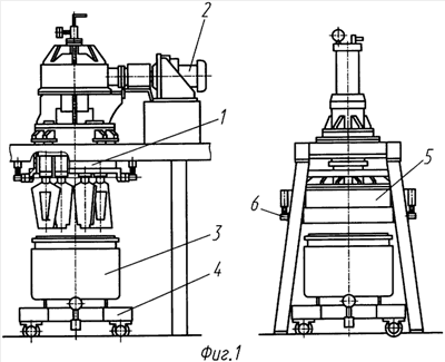 Предлагаемая установка для смешения и формования изображена на фиг.1. Установка состоит из вертикального смесителя 1 с приводом 2, чаши 3, установленной на тележке 4, выгрузочной головки 5 со стыковочными фиксирующими элементами 6.