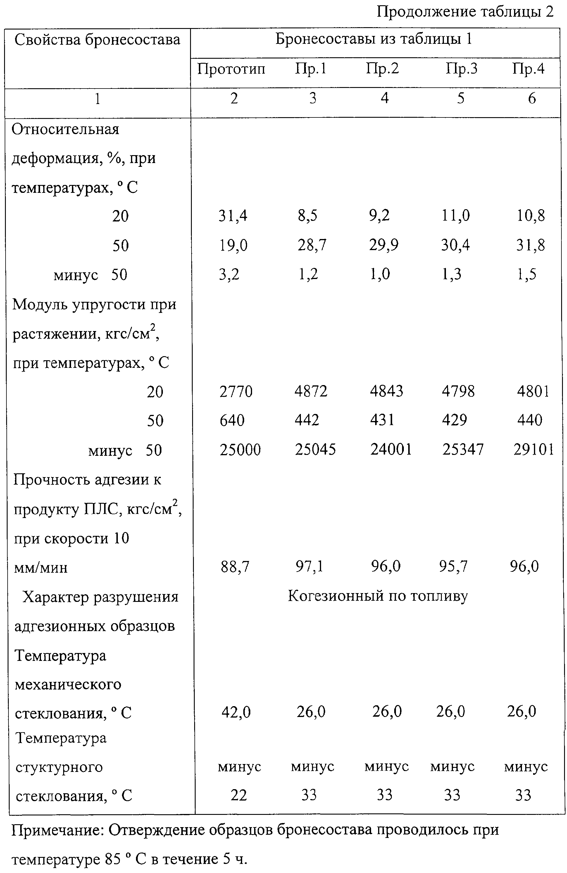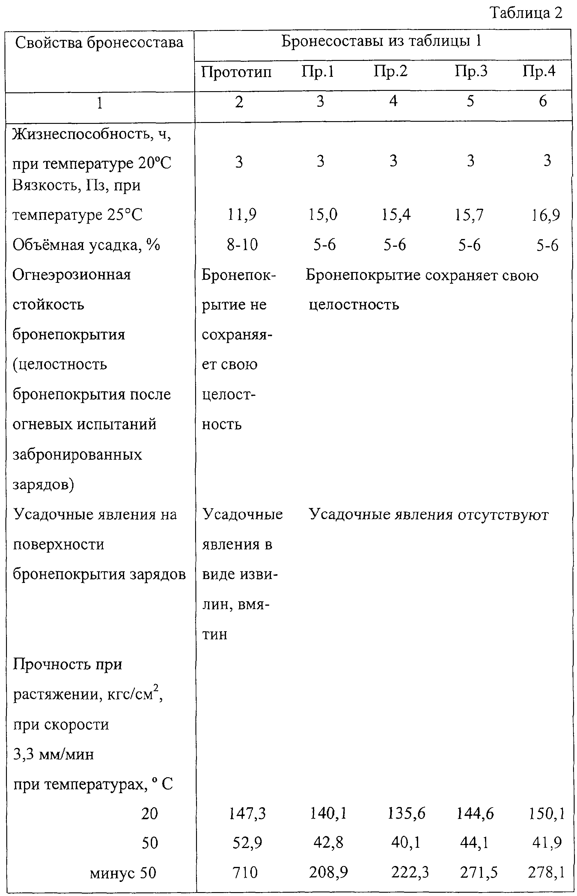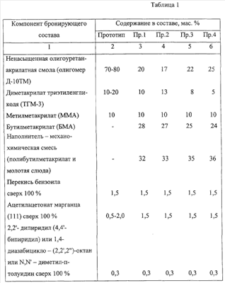 Используемое сочетание предлагаемых компонентов обеспечивает технологические свойства бронирующего состава, а также удовлетворительные механические, адгезионные свойства. Механохимическую смесь получают путем соединения 46,5-49,5 мас.% полибутилметакрилата и 50,5-53,5 мас.% молотой слюды в процессе вальцевания на горизонтальных вальцах. Введение наполнителя – механохимической смеси полибутилметакрилата и молотой слюды, растворенного в бутилметакрилате, снижает усадочные явления при полимеризации и повышает огнеэрозионную стойкость бронирующего состава. Приготовление заявляемого бронесостава осуществляется с использованием стандартного оборудования. Ниже приведен пример приготовления бронесостава. В мешатель, снабженный мешалкой, загружается бутилметакрилат, наполнитель – механохимическая смесь полибутилметакрилата и молотой слюды, перемешивается в течение 2-3 ч, затем вводится олигомер Д-10ТМ, ТГМ-3. Все содержимое мешателя перемешивается в течение 20-40 мин. Перекись бензоила, ацетилацетонат марганца (111) растворяются во всем объеме ММА в течение 10-30 мин. В последнюю очередь в навеску ММА вводится ускоритель 2,2′-дипиридил(4,4′-бипиридил) или 1,4-диазабицикло-(2,2′,2″)-октан или N,N’-диметил-п-толуидин, затем смесь перемешивается в течение 15-20 мин и вводится в мешатель. Содержимое мешателя перемешивается при вакуумировании в течение 20-30 мин. Бронирование зарядов предлагаемых бронесоставом производится методом заливки или методом центробежного литья. Техническая сущность предлагаемого изобретения представляется нижеприведенными экспериментальными данными. В таблице 1 приведена рецептура огнеэрозионностойкого бронирующего состава в сравнении с прототипом, в таблице 2 приведены механические, адгезионные, физические характеристики примеров состава. Проверка заявляемого огнеэрозионностойкого бронирующего состава на зарядах к противоградовой ракете «АС» показала, что качество бронепокрытия монолитное, огнеэрозионностойкое, без усадочных явлений, удовлетворяющее требованиям конструкторской и технологической документации. При огневых испытаниях зарядов бронепокрытие сохранялась в виде целого стакана, слегка утонченного со стороны горящего торца, что свидетельствует о его достаточной огнеэрозионной стойкости. С использованием предлагаемого бронирующего состава отработан с положительными результатами технологический процесс бронирования зарядов к противоградовой ракете «АС» на опытно-химическом заводе ФГУП «НИИ ПМ». Использование данного огнеэрозионностойкого бронирующего состава позволяет: – повысить огнеэрозионную стойкость бронепокрытия; – повысить качество бронирования зарядов вследствие уменьшения усадочных явлений при полимеризации бронесостава; – обеспечить удовлетворительные механические, адгезионные, физические характеристики бронепокрытий. Таким образом, заявляемый огнеэрозионностойкий бронирующий состав на основе ненасыщенной олигоуретанакрилатной смолы – олигомера Д-10ТМ, диметакрилата триэтиленгликоля ТГМ-3 в сочетании с наполнителем – механохимической смесью, состоящей из полибутилметакрилата и молотой слюды, растворенным в бутилметакрилате, обладает технологическими свойствами, которые позволяют проводить качественную заливку зарядов, что обеспечивает получение о