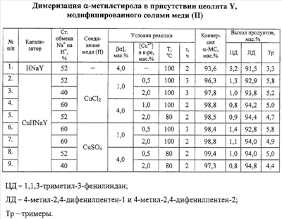 Это достигается тем, что способ получения ненасыщенных димеров -метилстирола путем олигомеризации -метилстирола осуществляют согласно изобретению в присутствии цеолита Y, полученного прямым синтезом, с мольным соотношением SiO2/Al2O3=6,2 и степенью обмена ионов Na+ на H+, равной 40÷60%, содержащего 0,5÷2,0 мас.% ионов Cu2+, при температуре реакции 80÷100°С и количестве катализатора 1÷4 мас.%