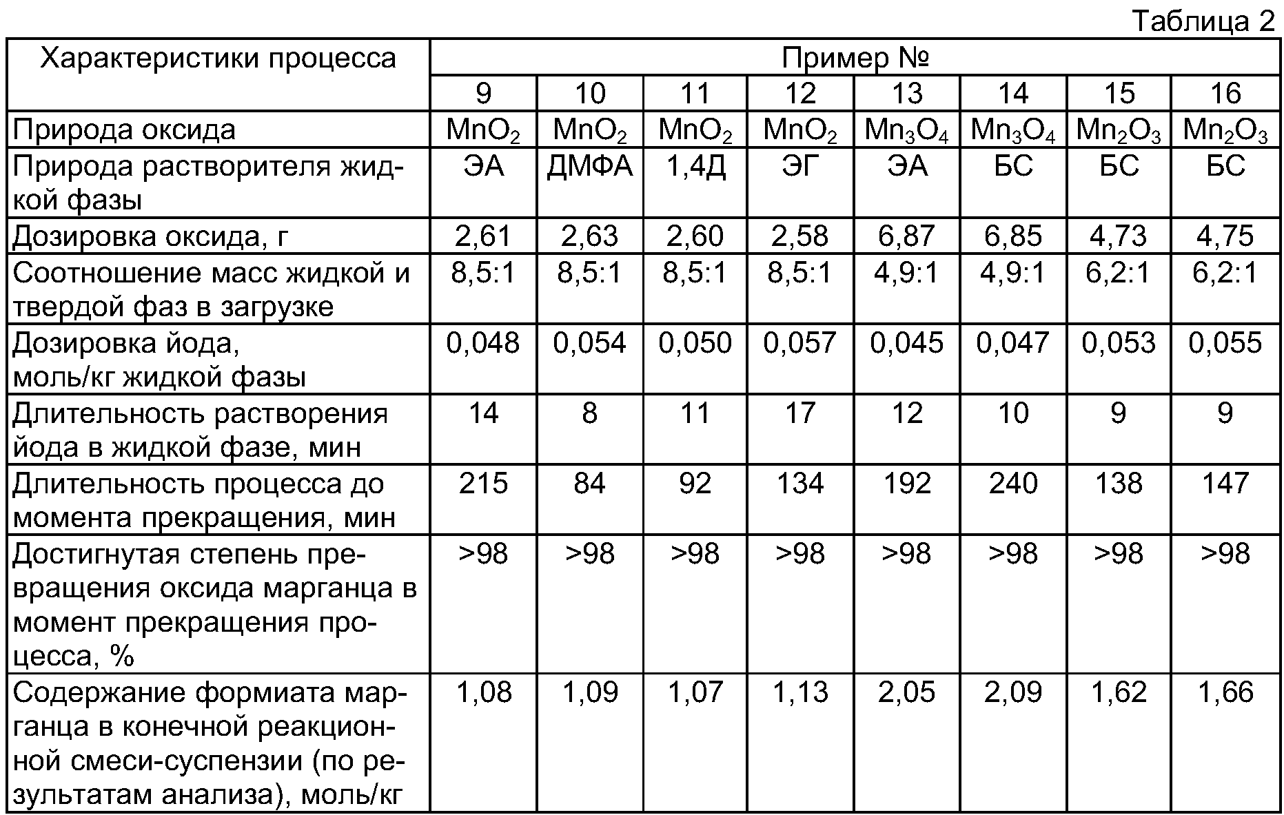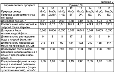 Примеры №9-16. Реакционный аппарат, соотношение масс загруженной жидкой фазы и бисера, концентрация муравьиной кислоты в жидкой фазе, массы жидкой фазы и металла, мольное соотношение загрузок металла и оксида, способ приготовления жидкой фазы, последовательности операций при загрузке, проведении процесса и выделении продукта, а также стимулирующая добавка аналогичны описанным в примере 1. Отличаются природой оксида и растворителя, жидкой фазы системы, а также соотношением масс жидкой и твердой фаз в загрузке. Полученные результаты сведены в табл. 2. Обозначения: ЭА – этилацетат, ЭГ – этиленгликоль, ЭЦ – этилцеллозольв, 1,4Д – 1,4-диоксан Положительный эффект предлагаемого решения состоит: 1. Метод довольно прост в исполнении, не требует подвода внешнего тепла и соориентирован на вполне доступное сырье. 2. Упрощается состав реакционной смеси за счет использования индивидуальных соединений. При этом примерно для половины накапливаемой соли сырьем является оксид марганца, являющийся природным соединением. 3. Аппаратурное оформление процесса простое и не содержит котлонадзорного оборудования. Данный процесс можно с успехом провести в малоотходном варианте. В нем не образуются и не накапливаются какие-либо нежелательные ингибиторы, что дает возможность проведения последующих серий в аппаратах с заполненными мертвыми зонами и не терять реакционную смесь по этой причине. Нет никаких ограничений и на возврат отработанной жидкой фазы и непрореагировавшего металла и его диоксида в повторный процесс. 4. Довольно простая очистка соли от твердых примесей и перекристаллизация сводят потери на этой стадии к минимуму.