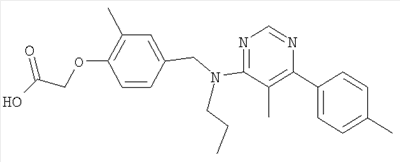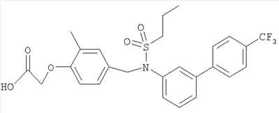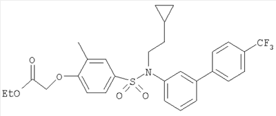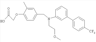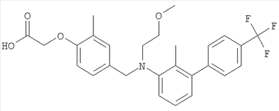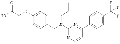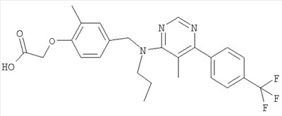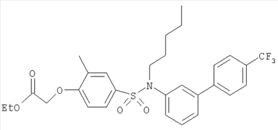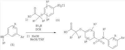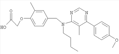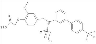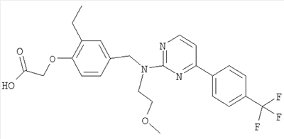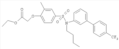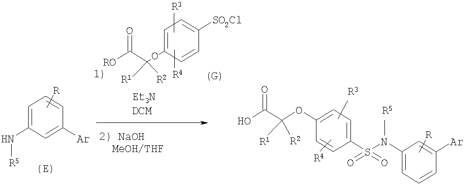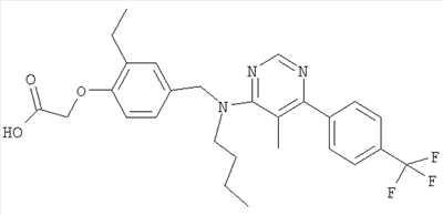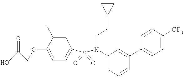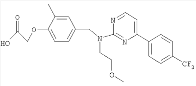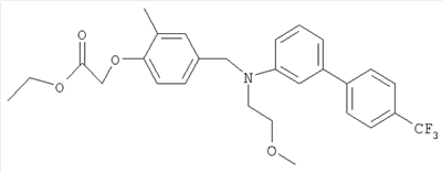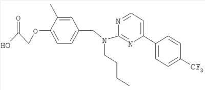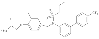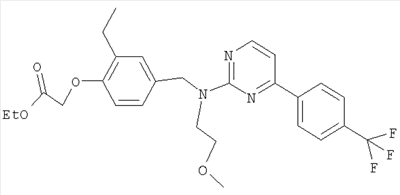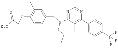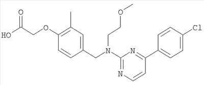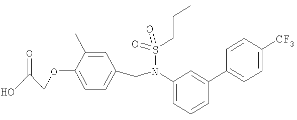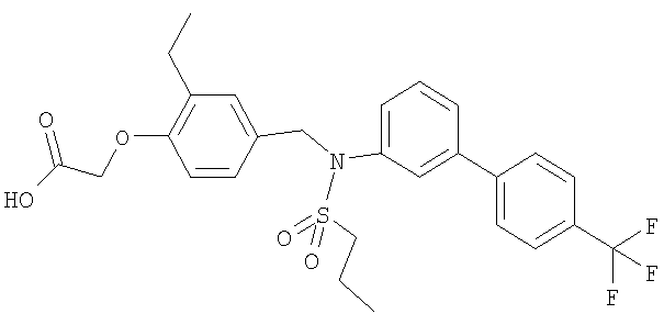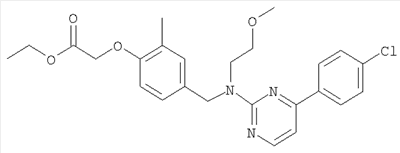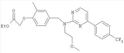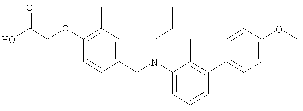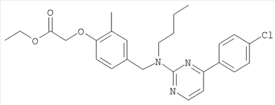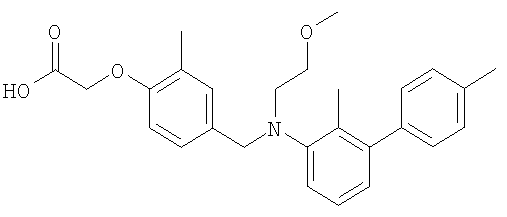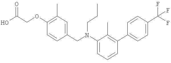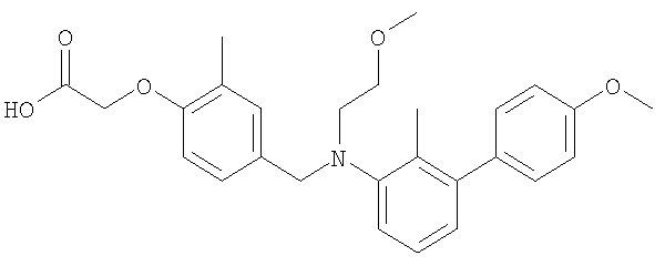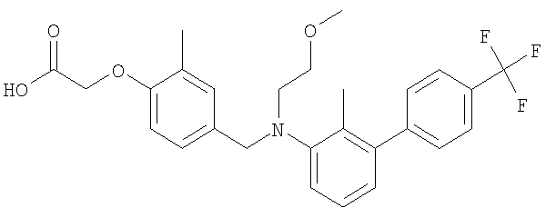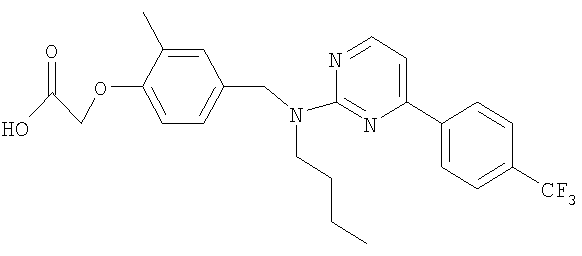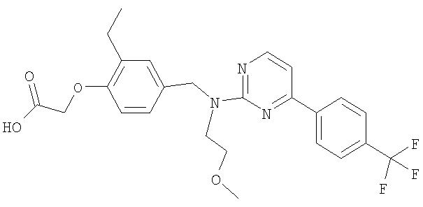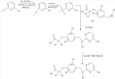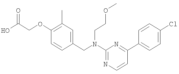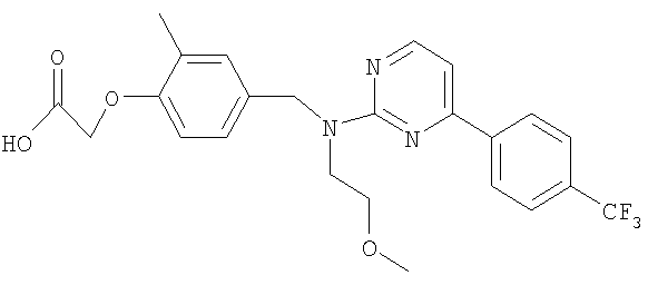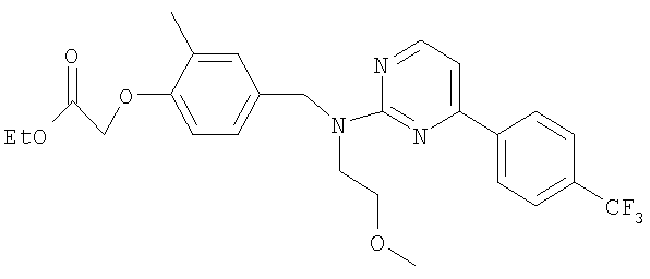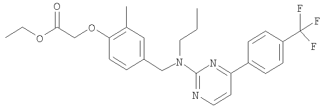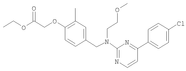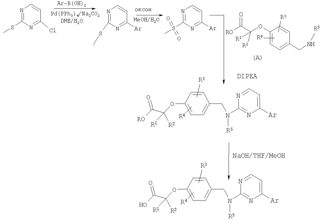Раствор 4-(4-хлорфенил)-2-(метилтио)пиримидина (3 г; 12,71 ммоль) в метаноле (125 мл) и воде (125 мл) в атмосфере азота при 4°С обрабатывали оксоном LC/MS: m/z 269 [М+Н]+, Rt 2,82 мин. Промежуточное соединение 44: этил-{4-[(бутил{4-[4-(трифторметил)фенил]пиримидин-2-ил}амино)метил]-2-метилфенокси}-ацетат Смесь 2-(метилсульфонил)-4-[4-(трифторметил)фенил]пиримидина (0,3, г; 1 ммоль), N,N-диизопропилэтиламина (0,18 мл; 1 ммоль) и этил-{4-[(бутиламино)метил]-2-метилфенокси}ацетата (0,424 г; 1,53 ммоль) нагревали при 100°С в герметично закрытом реакционном сосуде в течение 18 ч. Остаток растворяли в CH2Cl2 и очищали Biotage 1H ЯМР (400 МГц; CDCl3) Промежуточное соединение 45: этил-[4-({бутил[4-(4-хлорфенил)-пиримидин-2-ил]амино}метил)-2-метилфенокси]ацетат К смеси этил-{4-[(бутиламино)метил]-2-метилфенокси}ацетата (686 мг; 2,46 ммоль) и N,N-диизопропилэтиламина (285 мкл; 1,64 ммоль) добавляли 4-(4-хлорфенил)-2-(метилсульфонил)пиримидин (439 мг; 1,64 ммоль) и полученную смесь нагревали при 100°С в течение 16 ч в реакционном сосуде. Охлажденную реакционную смесь затем обрабатывали N,N-диизопропилэтиламином (285 мкл; 1,64 ммоль) и нагревали в течение еще 16 ч при 100°С в реакционном сосуде. Охлажденные реакционные смеси разбавляли CH2Cl2 (30 мл), промывали водой (20 мл), водную фазу экстрагировали СН2Cl2 (30 мл), СН2Cl2 экстракты объединяли и растворитель удаляли под вакуумом. В результате очистки Biotage 1H ЯМР (400 МГц; CDCl3) LC/MS: m/z 468 [М+Н]+, Rt 4,34 мин. Промежуточное соединение 46: этил-[4-[((2-метоксиэтил){4-[4-(трифторметил)фенил]пиримидин-2-ил}амино)метил]-2-метилфенокси}-ацетат Смесь 2-(метилсульфонил)-4-[4-(трифторметил)фенил]пиримидина (0,2 г; 0,66 ммоль), N,N-диизопропилэтиламина (0,11 мл; 0,66 ммоль) и этил-(4-{[(2-метоксиэтил)амино]метил}-2-метилфенокси)ацетата (0,28 г; 0,99 ммоль) нагревали при 100°С в герметично закрытом реакционном сосуде в течение 20 часов. Реакционную смесь затем оставляли достигать комнатной температуры и остаток растворяли в СН2Cl2 (30 мл), органический экстракт промывали водой (20 мл) и пропускали через гидрофобную фритту, затем концентрировали под вакуумом. В результате очистки Biotage LC/MS: m/z 503,8 [M+H]+, Rt 4,1 мин. Промежуточное соединение 47: этил-(4-{[[4-(4-хлорфенил)-пиримидин-2-ил](2-метоксиэтил)амино]метил}-2-метилфенокси)ацетат Получали из этил-(4-{[(2-метоксиэтил)амино]метил}-2-метилфенокси)-ацетата, используя методику синтеза, описанную для Промежуточного соединения 45. В результате очистки Biotage 1H ЯМР (400 МГц; CDCl3) LC/MS: m/z 470 [M+H]+, Rt 3,98 мин. Промежуточное соединение 48: этил-{2-метил-4-[(пропил{4-[4-(трифторметил)фенил]пиримидин-2-ил}амино)метил]фенокси}ацетат К смеси этил-{2-метил-4-[(пропиламино)метил]фенокси}ацетата (652 мг; 2,46 ммоль) и N,N-диизопропилэтиламина (570 мкл; 3,28 ммоль) добавляли 2-(метилсульфонил)-4-[4-(трифторметил)фенил]пиримидин (495 мг; 1,64 ммоль) и полученную смесь нагревали при 100°С в течение 16 ч в реакционном сосуде. Охлажденную реакционную смесь разбавляли СН2Cl2 (30 мл), промывали водой (20 мл), водную фазу экстрагировали СН2Cl2 (30 мл), CH2Cl2 экстракты объединяли и растворитель удаляли под вакуумом. В результате очистки Biotage 1H ЯМР (400 МГц; CDCl3) LC/MS: m/z 488 [M+H]+, Rt 4,24 мин. Промежуточное соединение 49: 2-хлор-6-[4-(трифторметил)фенил]-пиразин
