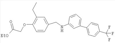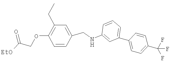 К раствору этил-[2-этил-4-(гидроксиметил)фенокси]ацетата (2,74 г; 11,5 ммоль) в хлороформе (250 мл) добавляли диоксид марганца (10 г; 11,5 ммоль). Полученную смесь перемешивали в течение 18 ч при комнатной температуре. Смесь фильтровали через набивку целита и затем концентрировали под вакуумом с получением указанного в заголовке соединения в виде бледно-желтого масла (2,7 г). LC/MS: m/z 237,2 [M+H]+, Rt 3,1 мин. Промежуточное соединение 87: этил-[2-этил-4-({[4′-(трифторметил)-1,1′-бифенил-3-ил]амино}метил)фенокси]ацетат К раствору этил-(2-этил-4-формилфенокси)ацетата (0,3 г; 1,27 ммоль) в безводном СН2Cl2 (12 мл) добавляли 4 LC/MS: m/z 458,2 [M+H]+, Rt 4,1 мин. Промежуточное соединение 88: этил-{4-[(бутиламино)метил]-2-этилфенокси}ацетат