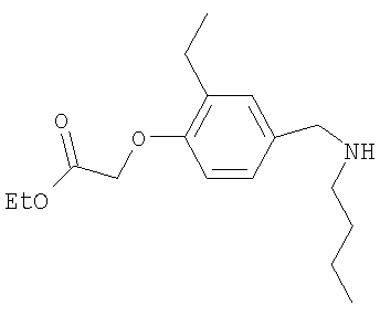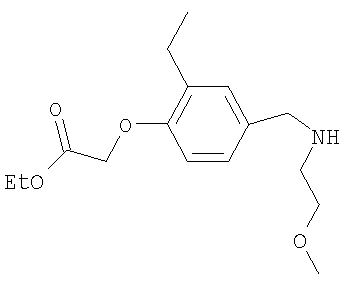 К раствору этил-(2-этил-4-формилфенокси)ацетата (0,52 г; 2,2 ммоль) в безводном этаноле (10 мл) добавляли бутиламин (0,26 мл; 2,6 ммоль). Полученный раствор перемешивали при комнатной температуре в атмосфере N2 в течение 18 ч над 4Å молекулярными ситами. Реакционную смесь гасили осторожным добавлением насыщенного водного NaHCO3 (30 мл) и смесь перемешивали в течение 30 мин. Смесь затем экстрагировали EtOAc (2×100 мл). Объединенные органические экстракты сушили (MgSO4), фильтровали и концентрировали под вакуумом. Проводили очистку посредством SPE (SCX, 20 г), обрабатывая картридж этанолом, затем наносили соединение и промывали CH2Cl2, затем этанолом, потом элюировали указанное в заголовке соединение, используя 10%-ный NH3 в этаноле, выпаривали 10%-ный NH3 в этанольном экстракте с получением указанного в заголовке соединения в виде бледно-желтого масла (0,364 г). LC/MS: m/z 294,3 [М+Н]+, Rt 2,43 мин. Промежуточное соединение 89: этил-[2-этил-4-{[2-(метоксиэтил)-амино]метил}фенокси]ацетат
