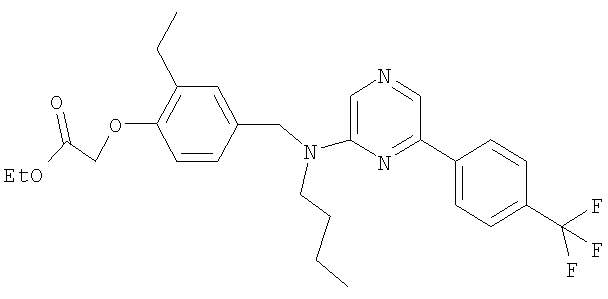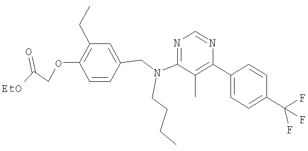 Использовали 2-метоксиэтиламин (0,23 мл; 0,26 ммоль) и методику синтеза, описанную для синтеза Промежуточного соединения 88. Проводили очистку посредством SPE (SCX, 20 г), обрабатывая картридж этанолом, затем наносили соединение и промывали CH2Cl2, затем этанолом, потом элюировали указанное в заголовке соединение, используя 10%-ный NH3 в этаноле, выпаривали 10%-ный NH3 в этанольном экстракте с получением указанного в заголовке соединения в виде бледно-желтого масла (0,341 г). LC/MS: m/z 296,2 [M+H]+, Rt 2,2 мин. Промежуточное соединение 90: этил-{4-[(бутил{6-[4-(трифторметил)-фенил]пиразин-2-ил}амино)метил]-2-этилфенокси}ацетат Смесь 2-хлор-6-[4-(трифторметил)фенил]пиразина (0,172 г; 0,56 ммоль), этил-{4-[(бутиламино)метил]-2-этилфенокси}ацетата (0,25 г; 0,85 ммоль) и N,N-диизопропилэтиламина (0,099 мл; 0,56 ммоль) нагревали вместе в реакционном сосуде при 100°С в течение 18 ч. Сосуд затем оставляли охлаждаться до комнатной температуры, остаток растворяли в CH2Cl2 (50 мл) и органический раствор промывали водой (15 мл) и соляным раствором (10 мл). Раствор затем пропускали через гидрофобную фритту и упаривали. В результате очистки Biotage LC/MS: m/z 516,3 [M+H]+, Rt 4,3 мин. Промежуточное соединение 91: этил-{2-этил-4-[(2-метилоксиэтил){6-[4-(трифторметил)фенил]пиразин-2-ил}амино)метил]фенокси}ацетат Смесь 2-хлор-6-[4-(трифторметил)фенил]пиразина (0,109 г; 0,36 ммоль), этил-[2-этил-4-{[2-(метоксиэтил)амино]метил}фенокси]ацетата (0,159 г; 0,54 ммоль) и N,N-диизопропилэтиламина (0,063 мл; 0,36 ммоль) нагревали вместе в реакционном сосуде при 100°С в течение 18 ч. Сосуд затем оставляли охлаждаться до комнатной температуры, остаток растворяли в СН2Cl2 (50 мл) и органический раствор промывали водой (15 мл) и соляным раствором (10 мл). Раствор пропускали через гидрофобную фритту и упаривали. В результате очистки Biotage LC/MS: m/z 518,3 [M+H]+, Rt 3,9 мин. Промежуточное соединение 92: этил-[4-({бутил[5-метил-6-(4-метилфенил)пиримидин-4-ил]амино}метил)-2-этилфенокси]ацетат Смесь этил-{4-[(бутиламино)метил]-2-этилфенокси}ацетата (0,23 г; 0,78 ммоль), N,N-диизопропилэтиламина (0,18 мл; 1,05 ммоль) и 4-хлор-5-метил-6-(4-метилфенил)пиримидина (0,114 г; 0,52 ммоль) нагревали при 100°С в герметично закрытом реакционном сосуде в течение 18 ч. После этого реакционный сосуд оставляли охлаждаться до комнатной температуры, остаток растворяли в CH2Cl2 (50 мл) и промывали водой (10 мл) и соляным раствором (10 мл). Органический экстракт разделяли с помощью гидрофобной фритты и упаривали. В результате очистки Biotage LC/MS: m/z 476,3 [M+H]+, Rt 3,6 мин. Промежуточное соединение 93: этил-[4-({бутил[2-метил-4 К раствору N-бутил-N-[2-метил-4 LC/MS: m/z 564,2 [M+H]+, Rt 4,2 мин. Промежуточное соединение 94: этил-[2-этил-4-({(пропилсульфонил)[4 К раствору этил-[2-этил-4-({[4 LC/MS: m/z 581,3 [M+NH4]+, Rt 4,0 мин. Промежуточное соединение 95: этил-[4-({бутил[6-(4-хлорфенил)-5-метилпиримидин-4-ил]амино}метил)-2-этилфенокси]ацетат Использовали 4-хлор-6-(4-хлорфенил)-5-метилпиримидин (0,125 г; 0,52 ммоль) и методику синтеза, описанную для Примера 92. В результате очистки Biotage LC/MS: m/z 496,2 [М+Н]+, Rt 4,0 мин. Промежуточное соединение 96: этил-{4-[(бутил{5-метил-6-[4-(трифторметил)фенил]пиримидин-4-ил}амино)метил]-2-этилфенокси}-ацетат Использовали 4-хлор-5-метил-6-[4-(трифторметил)фенил]пиримидин (0,143 г; 0,52 ммоль) и методику синтеза, описанную для соединения Примера 92. В результате очистки Biotage LC/MS: m/z 430,2 [M+H]+, Rt 4,2 мин. Промежуточное соединение 97: этил-{2-этил-4-[([2-(метилокси)этил]{4-[4-(трифторметил)фенил]пиримидин-2-ил}амино)-метил]фенокси}ацетат Смесь пиримидин-2-(метилсу