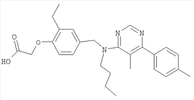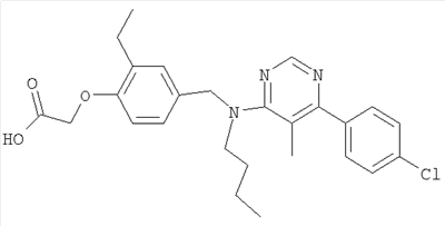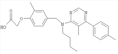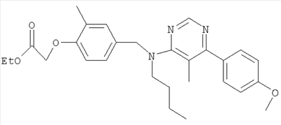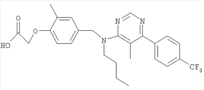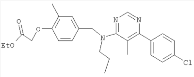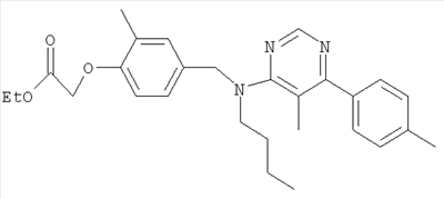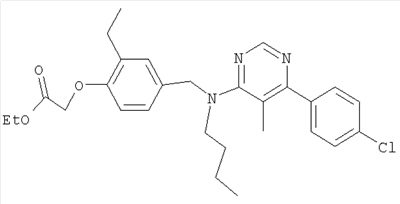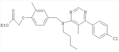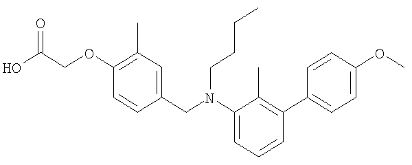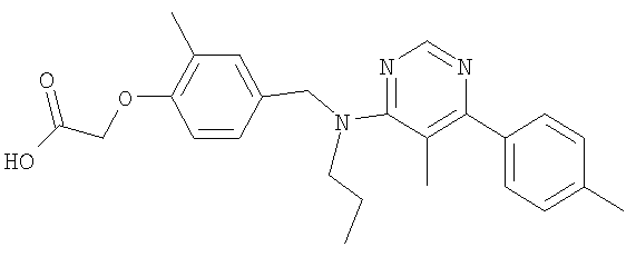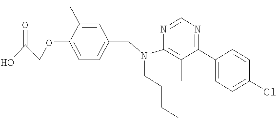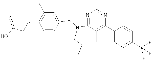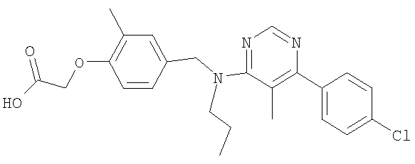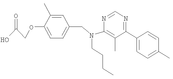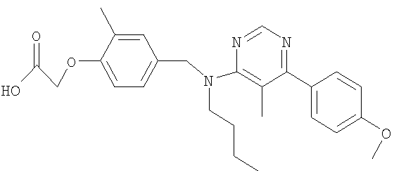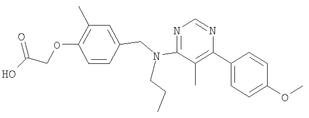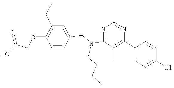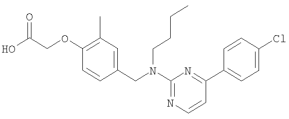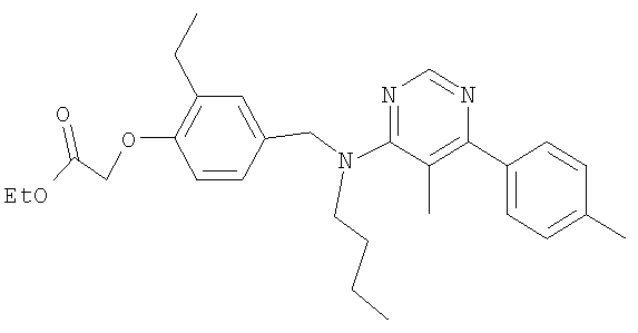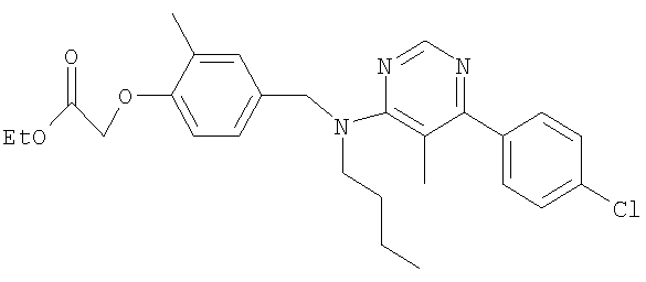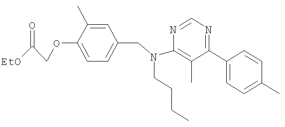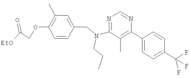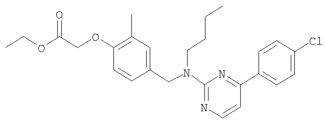 Получали из 4-метоксифенилбороновой кислоты (0,93 г; 6,13 ммоль) и 4,6-дихлор-5-метилпиримидина, используя методику, описанную для Промежуточного соединения 62. LC/MS: m/z 235,1 [М+Н]+, Rt 3,0 мин. Промежуточное соединение 66: этил-{4-[(бутил{5-метил-6-[4-(трифторметил)фенил]пиримидин-4-ил}амино)метил]-2-метилфенокси}-ацетат Смесь 4-хлор-5-метил-6-[4-(трифторметил)фенил]пиримидина (0,229 г; 0,84 ммоль), N,N-диизопропилэтиламина (0,293 мл; 1,68 ммоль) и этил-{4-[(бутиламино)метил]-2-метилфенокси}ацетата (0,35 г; 1,26 ммоль) нагревали при 100°С в герметично закрытом реакционном сосуде в течение 18 ч. Реакционную смесь затем оставляли достигать комнатной температуры, остаток растворяли в CH2Cl2 (50 мл), органический экстракт промывали водой (20 мл) и пропускали через гидрофобную фритгу, затем концентрировали под вакуумом. В результате очистки Biotage LC/MS: m/z 516,2 [М+Н]+, Rt 3,9 мин. Промежуточное соединение 67: этил-[4-({бутил[6-(4-метоксифенил)-5-метилпиримидин-4-ил]амино}метил)-2-метилфенокси]ацетат Смесь 4-хлор-6-(4-метоксифенил)-5-метилпиримидина (0,164 г; 0,7 ммоль), диизопропилэтиламина (0,24 мл; 1,4 ммоль) и этил-{4-[(бутиламино)метил]-2-метилфенокси}ацетата (0,29 г; 1,05 ммоль) нагревали при 100°С в герметично закрытом реакционном сосуде в течение 18 ч. Реакционную смесь затем оставляли достигать комнатной температуры. Остаток растворяли в CH2Cl2 (50 мл), органический раствор промывали водой (20 мл) и пропускали через гидрофобную фритту, затем концентрировали под вакуумом. В результате очистки Biotage LC/MS: m/z 478,3 [М+Н]+, Rt 3,2 мин. Промежуточное соединение 68: этил-[4-({бутил[6-(4-хлорфенил)-5-метилпиримидин-4-ил]амино}метил)-2-метилфенокси]ацетат Получали из 4-хлор-6-(4-хлорфенил)-5-метилпиримидина и этил-{4-[(бутиламино)метил]-2-метилфенокси}ацетата, используя методику получения Промежуточного соединения 67. LC/MS: m/z 482,2 [M+H]+, Rt 3,7 мин. Промежуточное соединение 69: этил-[4-({бутил[5-метил-6-(4-метилфенил)пиримидин-4-ил]амино}метил)-2-метилфенокси]ацетат Получали из 4-хлор-5-метил-6-(4-метилфенил)пиримидина и этил-{4-[(бутиламино)метил]-2-метилфенокси}ацетата, используя методику получения Промежуточного соединения 67. LC/MS: m/z 462,3 [M+H]+, Rt 3,4 мин. Промежуточное соединение 70: 2,4