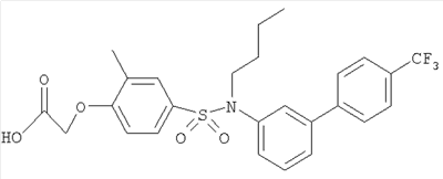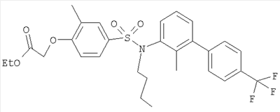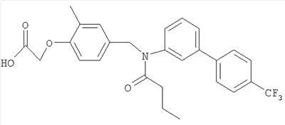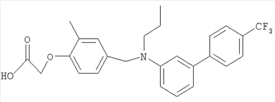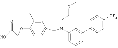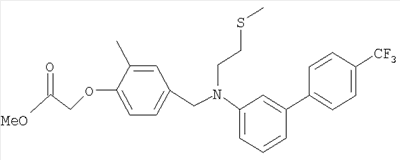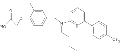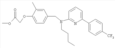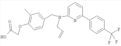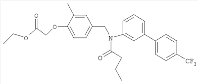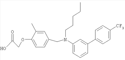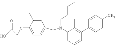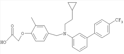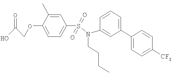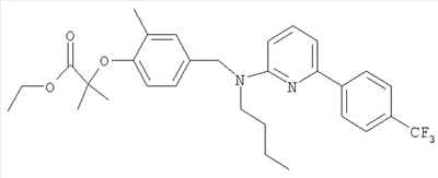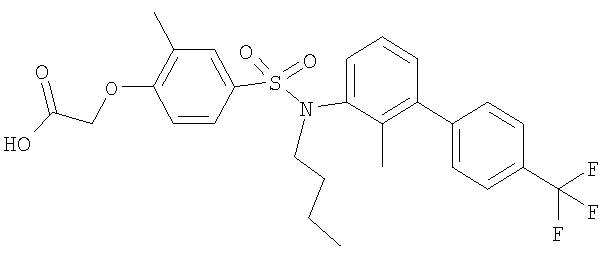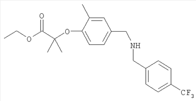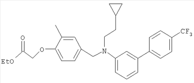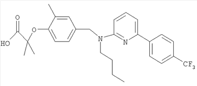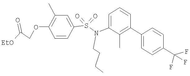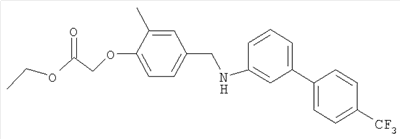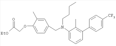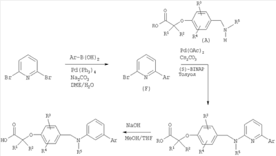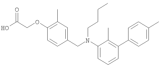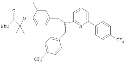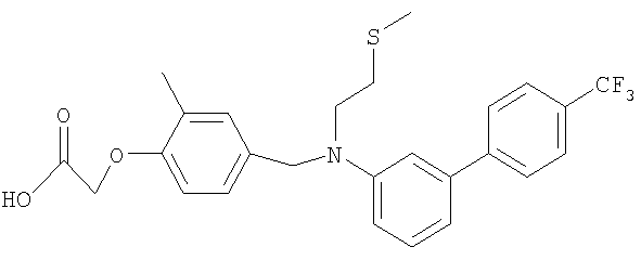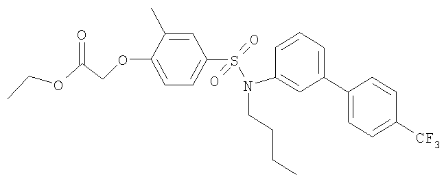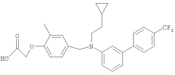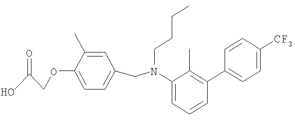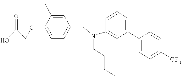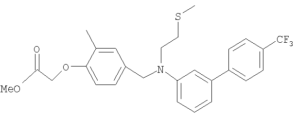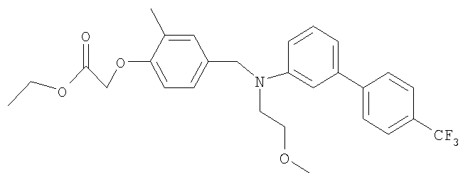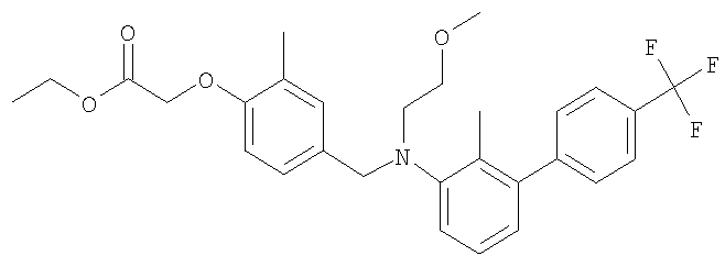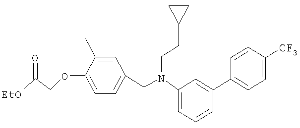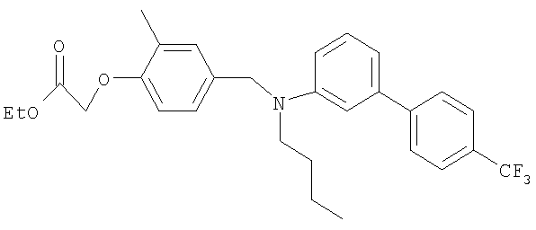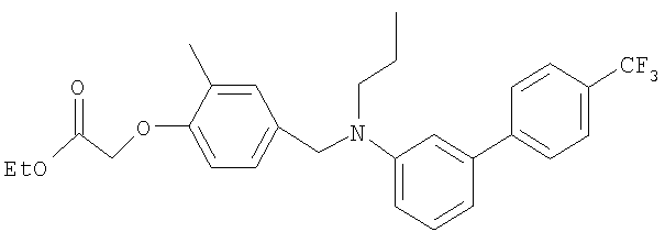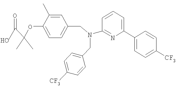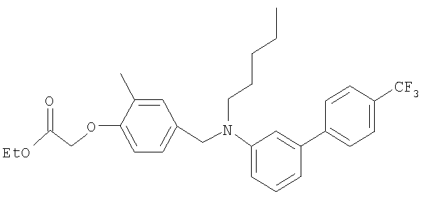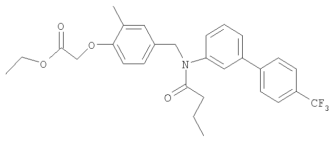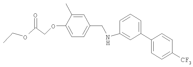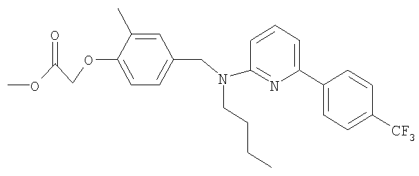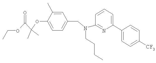 К раствору 2,6-дибромпиридина (1,25 г; 5,28 ммоль) в диметоксиэтане (100 мл) и воде (50 мл) добавляли 4-трифторметилфенилбороновую кислоту (1 г; 5,27 ммоль) и карбонат натрия (1,45 г; 13,7 ммоль). Полученную смесь продували азотом перед добавлением тетракис(трифенилфосфин)палладия(0) (60 мг; 0,05 ммоль). Реакционную смесь нагревали до кипения с обратным холодильником в атмосфере азота в течение 5 ч и затем оставляли охлаждаться до комнатной температуры. Растворители удаляли под вакуумом и остаток разбавляли водой (50 мл) и затем экстрагировали EtOAc (2×100 мл). Органический раствор сушили (MgSO4), фильтровали и растворители удаляли под вакуумом. В результате очистки Biotage 1Н ЯМР (400 МГц; CDCl3) Промежуточное соединение 2: этил-2-метил-2-{2-метил-4-[([4-(трифторметил)бензил]{6-[4-(трифторметил)фенил]пиридин-2-ил}амино)-метил]фенокси}пропаноат Смесь этил-2-метил-2-[2-метил-4-({[4-(трифторметил)бензил]амино}-метил)фенокси]пропаноата (0,13 г; 0,318 ммоль), 2-бром-6-[4-(трифторметил)-фенил]пиридина (78,5 мг; 0,26 ммоль), ацетата палладия(II) (4,8 мг; 0,021 ммоль), (R)-2,2′-бис(дифенилфосфино)-1,1 LC/MS: m/z 631,3 [M+H]+, Rt 4,7 мин. Промежуточное соединение 3: этил-2-{4-[(бутил{6-[4-(трифторметил)фенил]пиридин-2-ил}амино)метил]-2-метилфенокси}-2-метилпропаноат Ацетат палладия(II) (1,4 мг; 0,006 ммоль) и (S)-2,2′-бис(дифенилфосфино)-1,1 LC/MS: m/z 529,2 [M+H]+, Rt 4,7 мин. Промежуточное соединение 4: метил-{4-[(бутил{6-[4-(трифторметил)-фенил]пиридин-2-ил}амино)-метил]-2-метилфенокси}ацетат Ацетат палладия(II) (5,4 мг; 0,024 ммоль) и (S)-2,2′-бис(дифенилфосфино)-1,1 LC/MS: m/z 487,3 [М+Н]+, Rt 4,5 мин. Промежуточное соединение 5: этил-2-(4-формил-2-метилфенокси)-2-метилпропаноат