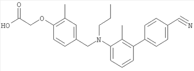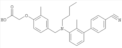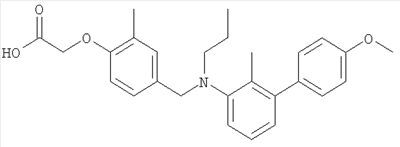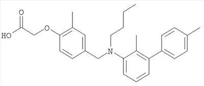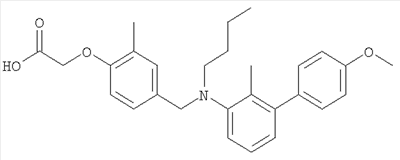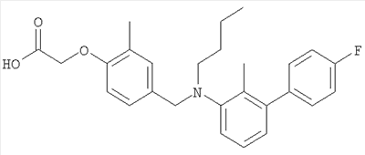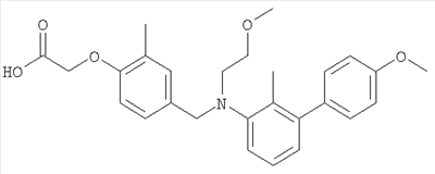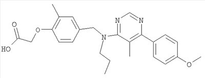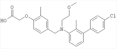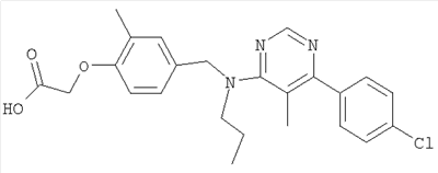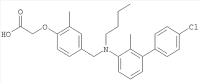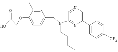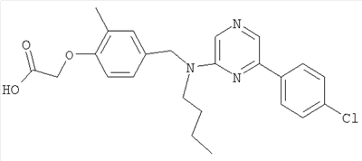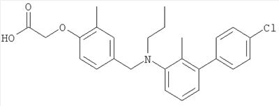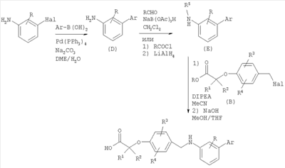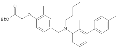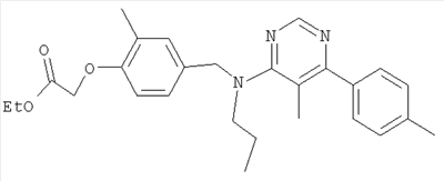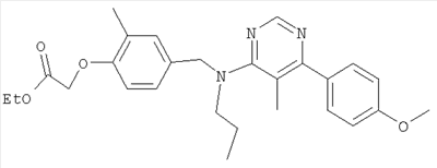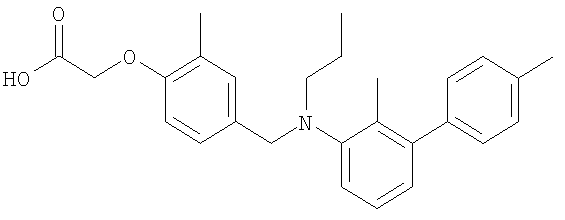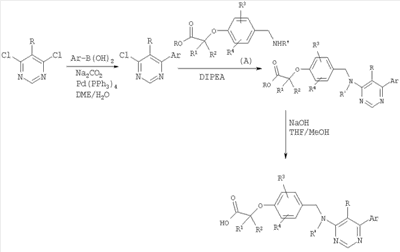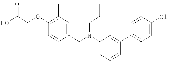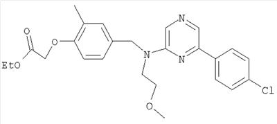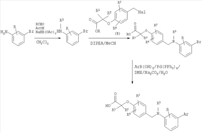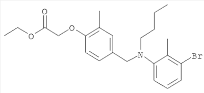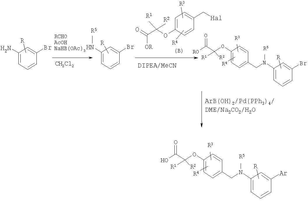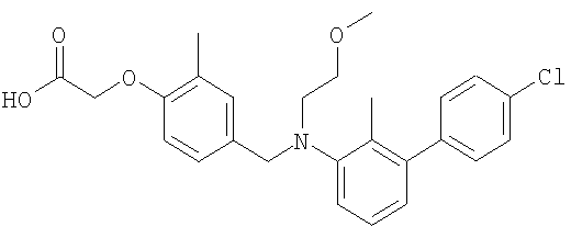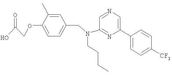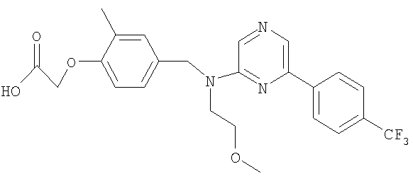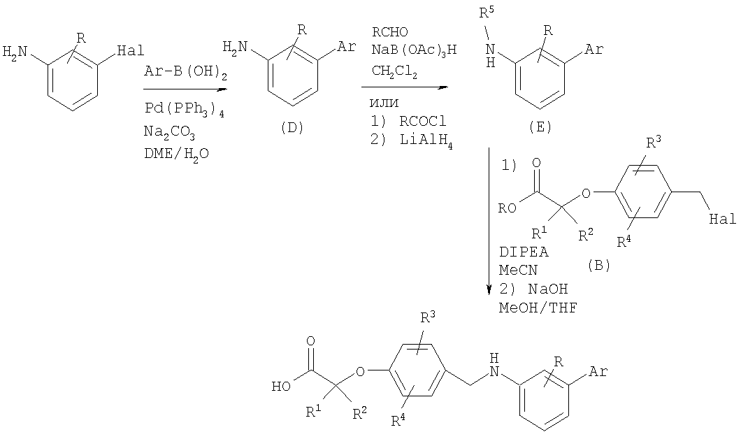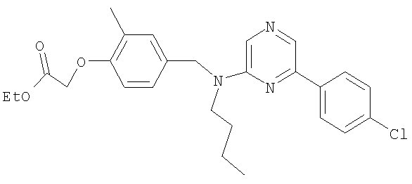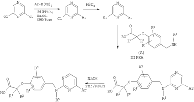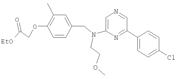 В колбу, содержащую 2-хлор-6-(4-хлорфенил)пиразин (2,35 г; 10,4 ммоль), добавляли трибромид фосфора (17 мл) и смесь нагревали с обратным холодильником в течение 6 ч в атмосфере азота. Реакционную смесь охлаждали до комнатной температуры, затем осторожно вливали в ледяную воду (600 мл), рН полученной смеси доводили до 6-7, используя водный аммиак, и экстрагировали диэтиловым эфиром (2×250 мл). Органический раствор сушили (MgSO4) и растворитель удаляли под вакуумом. Реакция не завершилась, поэтому остаток обрабатывали добавленным трибромидом фосфора (17 мл) и нагревали с обратным холодильником в течение еще 5 ч в атмосфере азота. В результате вышеописанной обработки получали указанное в заголовке соединение в виде бледно-желтого твердого вещества (0,97 г). LC/MS: m/z 270 [M+H]+, Rt 3,53 мин. Промежуточное соединение 77: этил-[4-({бутил[6-(4-хлорфенил)-пиразин-2-ил]амино}метил)-2-метилфенокси]ацетат Смесь 2-бром-6-(4-хлорфенил)пиразина (0,27 г; 1 ммоль), N,N-диизопропилэтиламина (0,18 мл; 1 ммоль) и этил-{4-[(бутиламино)метил]-2-метилфенокси}ацетата (0,42 г; 1,5 ммоль) нагревали при 100°С в герметично закрытом реакционном сосуде в течение 18 ч. Реакционную смесь затем оставляли достигать комнатной температуры и остаток растворяли в CH2Cl2 (50 мл), органический экстракт промывали водой (15 мл) и пропускали через гидрофобную фритту, затем концентрировали под вакуумом. В результате очистки Biotage LC/MS: m/z 468 [M+H]+, Rt 4,2 мин. Промежуточное соединение 78: этил-[4-({[6-(4-хлорфенил)пиразин-2-ил][2-(метилокси)этил]амино}метил)-2-метилфенокси]ацетат Использовали этил-(4-{[(2-метоксиэтил)амино]метил}-2-метилфенокси)-ацетат (0,42 г; 1,5 ммоль) и методику синтеза, описанную для Промежуточного соединения 77. В результате очистки Biotage LC/MS: m/z 470 [M+H]+, Rt 3,8 мин. Промежуточное соединение 79: этил-{2-метил-4-[(пропил{6-[4-(трифторметил)фенил]пиразин-2-ил}амино)метил]фенокси}ацетат Использовали 2-хлор-6-[4-(трифторметил)фенил]пиразина (0,303 г; 1 ммоль) и этил-{2-метил-4-[(пропиламино)метил]фенокси}ацетат (0,4 г; 1,5 ммоль) и методику синтеза, описанную для Промежуточного соединения 77. В результате очистки Biotage LC/MS: m/z 488 [M+H]+, Rt 4,1 мин. Промежуточное соединение 80: этил-(2-метил-4-{[{5-метил-6-[4-(трифторметил)фенил]пиримидин-4-ил}(пропил)амино]метил}фенокси)-ацетат Смесь этил-{2-метил-4-[(пропиламино)метил]фенокси}ацетата (0,279 г; 1,05 ммоль), N,N-диизопропилэтиламина (0,24 мл; 1,4 ммоль) и 4-хлор-5-метил-6-[4-(трифторметил)фенил]пиримидина (0,191 г; 0,7 ммоль) нагревали при 100°С в герметично закрытом реакционном сосуде в течение 18 ч. После этого реакционный сосуд оставляли охлаждаться до комнатной температуры, остаток растворяли в СН2Cl2 (50 мл) и промывали водой (20 мл). Органический экстракт разделяли с помощью гидрофобной фритты и упаривали. В результате очистки Biotage LC/MS: m/z 502,2 [M+H]+, Rt 3,8 мин. Промежуточное соединение 81: этил-(4-{[[6-(4-хлорфенил)-5-метилпиримидин-4-ил](пропил)амино]метил}-2-метилфенокси)ацетат Использовали 4-хлор-6-(4-хлорфенил)-5-метилпиримидин (167 мг; 0,7 ммоль) и методику синтеза, описанную для Промежуточного соединения 80. В результате очистки Biotage LC/MS: m/z 468,1 [М+Н]+, Rt 3,6 мин. Промежуточное соединение 82: этил-(2-метил-4-{[[5-метил-6-(4-метилфенил)пиримидин-4-ил](пропил)амино]метил}фенокси)ацетат Использовали 4-хлор-5-метил-6-(4-метилфенил)пиримидин (153 мг; 0,7 ммоль) и методику синтеза, описанную для Промежуточного соединения 80. В результате очистки Biotage LC/MS: m/z 448,2 [М+Н]+, Rt 3,2 мин. Промежуточное соединение 83: этил-(2-метил-4-{[{5-м