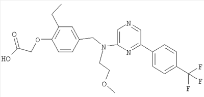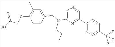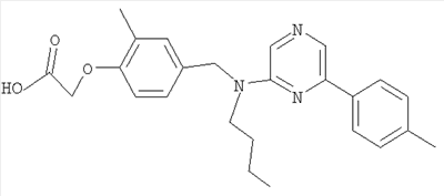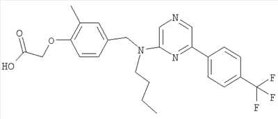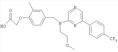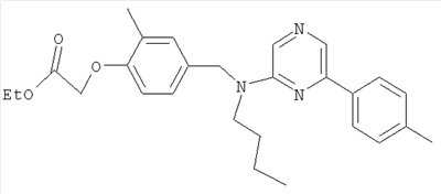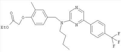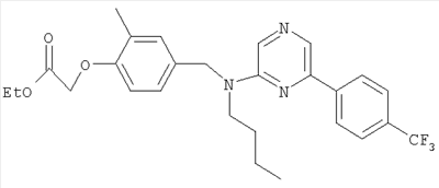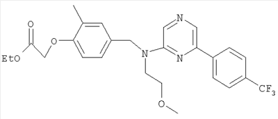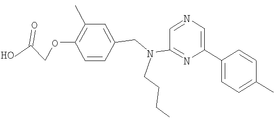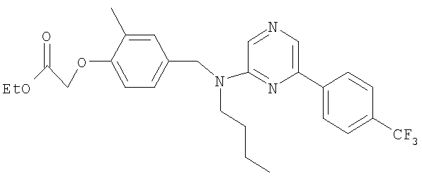 В колбу, содержащую 2-хлор-6-(4-метилфенил)пиразин (2,5 г; 12,3 ммоль), добавляли трибромид фосфора (20 мл) и смесь нагревали с обратным холодильником в течение 6 ч в атмосфере азота. Реакционную смесь охлаждали до комнатной температуры, затем аккуратно вливали в ледяную воду (600 мл). Полученный раствор доводили до рН 6-7, используя водный аммиак, и экстрагировали Et2O (2×250 мл). Органический раствор сушили (MgSO4) и растворитель удаляли под вакуумом с получением указанного в заголовке соединения в виде твердого вещества белого цвета (2,32 г). LC/MS: m/z 249,0; 251,0 [M+H]+, Rt 3,4 мин. Промежуточное соединение 53: этил-{4-[(бутил{6-[4-(трифторметил)фенил]-пиразин-2-ил}амино)метил]-2-метилфенокси}-ацетат Смесь 2-бром-6-[4-(трифторметил)фенил]пиразина (0,5 г; 1,6 ммоль), N,N-диизопропилэтиламина (0,29 мл; 1,6 ммоль) и этил-{4-[(бутиламино)метил]-2-метилфенокси}ацетата (0,5 г; 1,8 ммоль) нагревали при 100°С в герметично закрытом реакционном сосуде в течение 18 ч. Реакционную смесь затем оставляли достигать комнатной температуры, остаток растворяли в СН2Cl2 (130 мл), органический экстракт промывали водой (30 мл), пропускали через гидрофобную фритту и концентрировали под вакуумом. В результате очистки Biotage LC/MS: m/z 501,8 [М+Н]+, Rt 4,3 мин. Промежуточное соединение 54: этил-[4-({бутил[6-(4-метилфенил)-пиразин-2-ил]амино}метил)-2-метилфенокси]ацетат Смесь 2-бром-6-(4-метилфенил)пиразина (0,25 г; 1 ммоль), N,N-диизопропилэтиламина (0,35 мл; 2 ммоль) и этил-{4-[(бутиламино)метил]-2-метилфенокси}ацетата (0,42 г; 1,5 ммоль) нагревали при 100°С в герметично закрытом реакционном сосуде в течение 18 ч. Реакционную смесь затем оставляли достигать комнатной температуры, остаток растворяли в CH2Cl2 (30 мл), органический экстракт промывали водой (15 мл) и пропускали через гидрофобную фритту, затем концентрировали под вакуумом. В результате очистки Biotage LC/MS: m/z 448,2 [M+H]+, Rt 4,1 мин. Промежуточное соединение 55: этил-{4-[((2-метоксиэтил){6-[4-(трифторметил)фенил]пиразин-2-ил}амино)метил]-2-метилфенокси}ацетат Смесь 2-бром-6-[4-(трифторметил)фенил]пиразина (0,5 г; 1,65 ммоль), N,N-диизопропилэтиламина (0,29 мл; 1,65 ммоль) и этил-(4-{[(2-метоксиэтил)-амино]метил}-2-метилфенокси)ацетата (0,7 г; 2,47 ммоль) нагревали при 100°С в герметично закрытом реакционном сосуде в течение 20 ч. Реакционную смесь затем оставляли достигать комнатной температуры, остаток разбавляли водой (40 мл) и экстрагировали СН2Cl2 (2×40 мл). Органический экстракт пропускали через гидрофобную фритту и концентрировали под вакуумом. В результате очистки Biotage LC/MS: m/z 503,8 [М+Н]+, Rt 4,0 мин. Промежуточное соединение 56: 3-бром-2-метил-N-пропиланилин