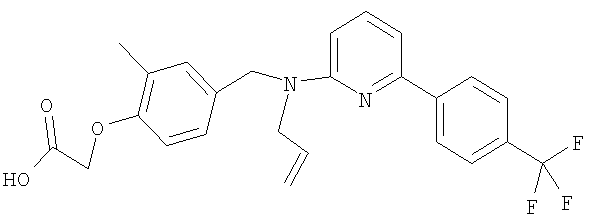 Смесь аллиламина (0,447 мл; 5,96 ммоль) и 2-бром-6-[4-(трифторметил)-фенил]пиридина (0,1 г; 0,298 ммоль) в этаноле (5 мл) нагревали при 100°С в 25 мл сосуде высокого давления. После нагревания в течение ночи реакционную смесь охлаждали и добавляли сульфат меди, нагревание продолжали при 100°С в течение ночи. После этого реакционную смесь оставляли охлаждаться до комнатной температуры и концентрировали под вакуумом. В результате очистки посредством SPE (диоксид кремния, 10 г), элюируя смесью циклогексан:хлороформ (3:1), получали указанное в заголовке соединение в виде темно-желтого твердого вещества (0,062 г). LC/MS: m/z 279,1 [М+Н]+, Rt 3,7 мин. Пример 1. 2-Метил-2-{2-метил-4-[([4-(трифторметил)бензил]{6-[4-(трифторметил)фенил]пиридин-2-ил}амино)метил]фенокси}пропановая кислота К раствору этил-2-метил-2-{2-метил-4-[([4-(трифторметил)бензил]{6-[4-(трифторметил)фенил]пиридин-2-ил}амино)метил]фенокси}пропаноата (0,07 г; 0,11 ммоль) в тетрагидрофуране (2 мл) и метаноле (2 мл) добавляли 2 М водный NaOH (1 мл). Полученный раствор перемешивали при комнатной температуре в течение 20 ч, затем концентрировали под вакуумом. Остаток подкисляли 2 М водным HCl и экстрагировали CH2Cl2 (2×30 мл). Объединенные органические экстракты сушили (Na2SO4), фильтровали и упаривали с получением указанного в заголовке соединения в виде бесцветного масла (60 мг). 1H ЯМР (400 МГц; CDCl3) LC/MS: m/z 603,2 [M+H]+, Rt 4,6 мин. Пример 2. 2-{4-[(Бутил{6-[4-(трифторметил)фенил]пиридин-2-ил}-амино)метил]-2-метилфенокси}-2-метилпропановая кислота К раствору этил-2-{4-[(бутил{-6-[4-(трифторметил)фенил]пиридин-2 ил}амино)метил]-2-метилфенокси}-2-метилпропаноата (45 мг; 0,085 ммоль) в метаноле (1,5 мл) и тетрагидрофуране (1,5 мл) добавляли 2 М водный NaOH (1 мл). Полученную смесь нагревали до 70°С в течение 1 ч и затем перемешивали при комнатной температуре в течение 18 ч, после чего нагревали до 70°С в течение следующих 4 ч. Реакционную смесь оставляли достигать комнатной температуры и растворители удаляли под вакуумом. Остаток подкисляли 2 М HCl и экстрагировали EtOAc (2×10 мл). Органический раствор сушили (MgSO4) и растворители удаляли под вакуумом. Очищали посредством аминопропил-SPE (5 г) с обработкой картриджа нанесением соединения и промыванием метанолом перед элюированием с использованием 10%-ного NH3 в метаноле. В результате выпаривания метанольного раствора аммиака получали белое твердое вещество, которое обрабатывали 1 М HCl (5 мл) и затем экстрагировали в СН2Cl2 (20 мл). Органический экстракт сушили (Na2SO4) и растворитель удаляли под вакуумом с получением указанного в заголовке соединения в виде бесцветного масла (19 мг). 1H ЯМР (400 МГц; CDCl3) LC/MS: m/z 501,2 [M+H]+, Rt 4,7 мин. Пример 3. {4-[(Бутил{6-[4-(трифторметил)фенил]пиридин-2-ил}-амино)метил]-2-метилфенокси}уксусная кислота К раствору метил-{4-[(бутил{6-[4-(трифторметил)фенил]пиридин-2-ил}амино)метил]-2-метилфенокси}ацетата (40 мг; 0,082 ммоль) в метаноле (2 мл) и тетрагидрофуране (2 мл) добавляли 2 М водный NaOH (2 мл). После перемешивания в течение 1 ч при комнатной температуре растворитель удаляли под вакуумом и остаток подкисляли 2 М HCl перед экстрагированием в этилацетат (2×15 мл). Органический раствор сушили (MgSO4) и растворители удаляли под вакуумом с получением указанного в заголовке соединения в виде твердого вещества белого цвета (35 мг). 1H ЯМР (400 МГц; CDCl3) LC/MS: m/z 473,2 [М+Н]+, Rt 5,0 мин. Пример 4. [4-({Бутил[4 К раствору этил-[4-({бутил[4 1H ЯМР (400 МГц; MeOH-d4) LC/MS: m/z 472,1 [М+Н]+, Rt 4,6 мин. Пример 5. [4-({(2-Метоксиэтил)[4 К раствору эт