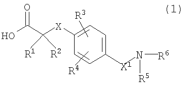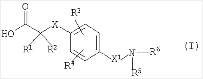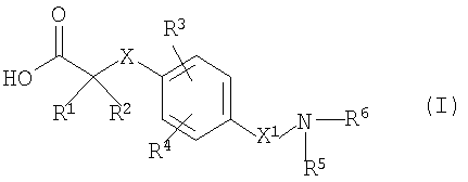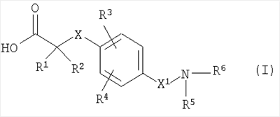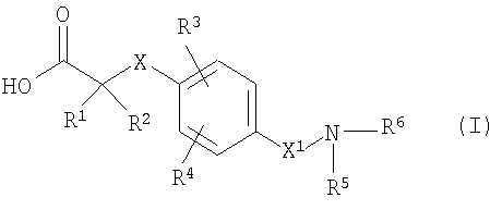где R1 и R2 независимо представляют собой водород или C1-3алкил; X представляет собой О; один из R3 и R4 независимо представляет собой водород, а другой представляет собой С1-3алкил; X1 представляет собой СН2 или SO2; R5 представляет собой -С1-6алкил (возможно замещенный С1-6алкокси или C1-6алкилтио), -С2-6алкенил, -С0-6алкилфенил (где фенил возможно замещен одним или более чем одним CF3, галогеном, C1-3алкилом, C1-3алкокси), -COC1-6алкил, SO2С1-6алкил; R6 представляет собой фенил или 6-членную гетероарильную группу, содержащую 1 или 2 атома N, причем фенил или гетероарильная группа возможно замещены 1, 2 или 3 группировками, выбранными из группы, состоящей из C1-6алкила, фенила (возможно замещенного одной или более чем одной группой, выбранной из галогена, CF3, C1-3алкила, OC1-3алкила, CN). 2. Соединение по п.1, где каждый из R1 и R2 независимо представляет собой Н или метил. 3. Соединение по п.2, где R1 и R2 оба представляют собой Н или оба представляют собой метил. 4. Соединение по п.3, где R1 и R2 оба представляют собой Н. 5. Соединение по п.1, где Х представляет собой О. 6. Соединение по п.3, где R3 и R4 независимо представляют собой Н или C1-3алкил. 7. Соединение по п.6, где один из R3 и R4 представляет собой Н, а другой представляет собой C1-3алкил, и C1-3алкильная группа расположена в ортоположении к группировке X. 8. Соединение по п.1, где X1 представляет собой СН2. 9. Соединение по п.1, где R5 представляет собой бутил или метоксиэтил. 10. Соединение по п.1, где R6 представляет собой фенил или 6-членный гетероцикл, выбранный из пиримидина, пиридина, пиридазина и пиразина, причем каждый из фенила или гетероцикла замещен фенилом (возможно замещенным одним или более чем одним CF3, C1-3алкилом, галогеном, CN) и возможно дополнительным C1-3алкильным заместителем. 11. Соединение по п.10, где фенил (возможно замещенный одним или более чем одним CF3, C1-3алкилом, галогеном, CN) находится в мета-положении к изображенному N. 12. Соединение по п.1, выбранное из 2-метил-2-{2-метил-4-[([4-(трифторметил)бензил]{6-[4-(трифторметил)фенил]-пиридин-2-ил}амино)метил]фенокси}пропановой кислоты; 2-{4-[(бутил{6-[4-(трифторметил)фенил]пиридин-2-ил}амино)метил]-2-метилфенокси}-2-метилпропановой кислоты; {4-[(бутил{6-[4-(трифторметил)фенил]пиридин-2-ил}амино)метил]-2-метилфенокси} уксусной кислоты; [4-({бутил[4 [4-({(2-метоксиэтил)[4 [2-метил-4-({пентил[4 [4-({(2-циклопропилэтил)[4 [2-метил-4-({пропил[4 [2-метил-4-({[2-(метилтио)этил][4 [4-({бутил[2-метил-4 [4-({(2-метоксиэтил)[2-метил-4 [4-({бутирил[4 [2-метил-4-({(пропилсульфонил)[4 [4-({бутил[4 [2-метил-4-({пентил[4 [4-({(2-циклопропилэтил)[4 {4-[(бутил{4-[4-(трифторметил)фенил]пиримидин-2-ил}амино)метил]-2-метилфенокси}уксусной кислоты; [4-({бутил[4-(4-хлорфенил)пиримидин-2-ил]амино}метил)-2-метилфенокси]-уксусной кислоты; {4-[((2-метоксиэтил){4-[4-(трифторметил)фенил]пиримидин-2-ил}амино)метил]-2-метилфенокси}уксусной кислоты; (4-{[[4-(4-хлорфенил)пиримидин-2-ил](2-метоксиэтил)амино]метил}-2-метилфенокси)уксусной кислоты; {2-метил-4-[(пропил{4-[4-(трифторметил)фенил]пиримидин-2-ил}амино)метил]-фенокси}уксусной кислоты; {4-[(бутил{6-[4-(трифторметил)фенил]пиразин-2-ил}амино)метил]-2-метилфенокси}уксусной кислоты; [4-({бутил[6-(4-метилфенил)пиразин-2-ил]амино}метил)-2-метилфенокси]-уксусной кислоты; {4-[((2-метоксиэтил){6-[4-(трифторметил)фенил]пиразин-2-ил}амино)метил]-2-метилфенокси}уксусной кислоты; (4-{[бутил(2,4 (4-{[бутил(4 (4-{[бутил(4 (4-{[бутил(4-метокси-2-метил-1,1 (4-{[бутил(4 (4-{[(4 (4-{[(2,4 (4-{[(2-метоксиэтил)(4 (2-метил-4-{[[2-метил-4 (4-{[(4 (4-{[(2,4 (4-{[(4 (4-{[