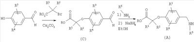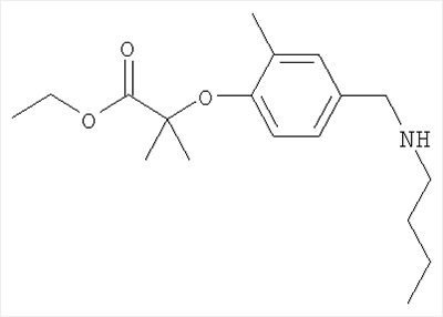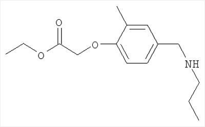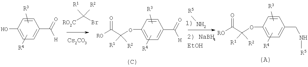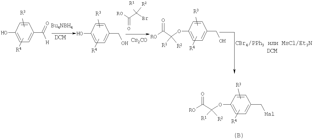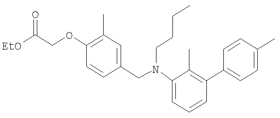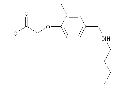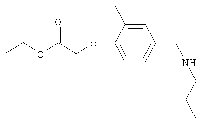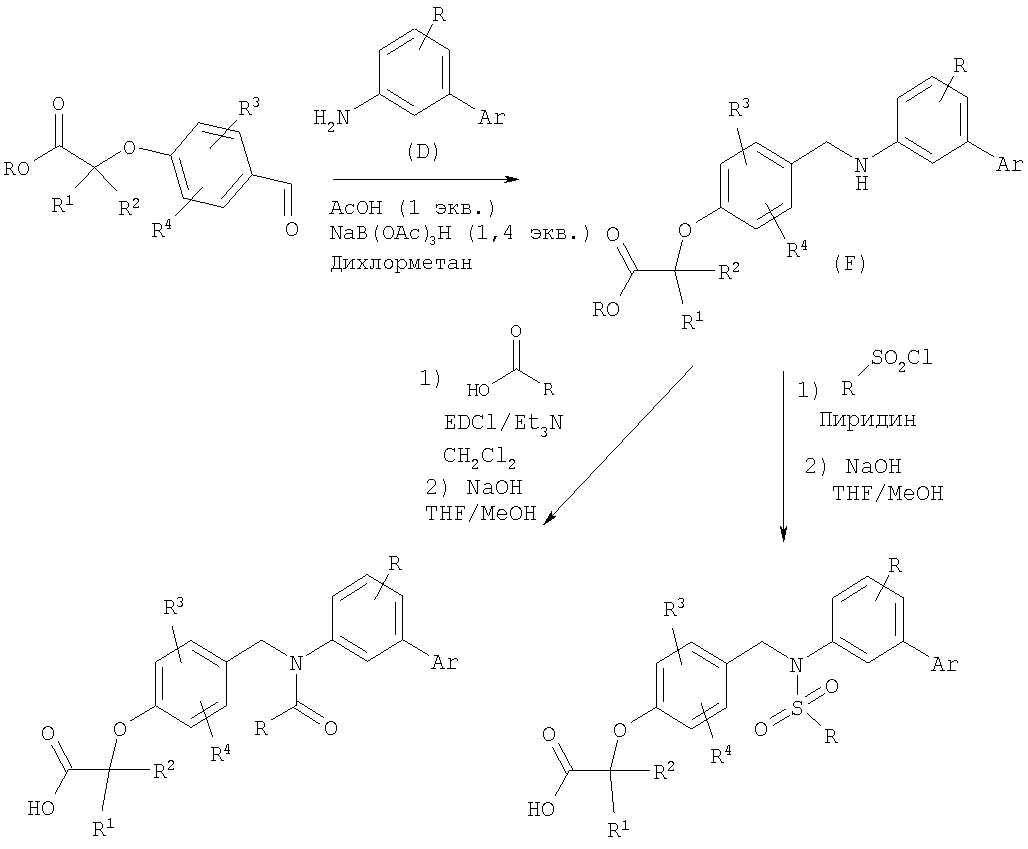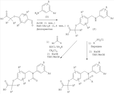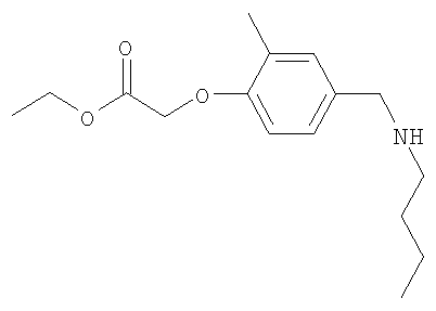 К раствору 4-гидрокси-3-метилбензальдегида (8 г; 58,8 ммоль) в безводном ацетонитриле (300 мл) в атмосфере азота при 0°С добавляли карбонат цезия (21 г; 64,6 ммоль) и этилбромацетат (6,52 мл; 58,8 ммоль). Полученную смесь оставляли достигать комнатной температуры и перемешивали в течение 16 ч. Реакционную смесь разбавляли водой (400 мл) и экстрагировали EtOAc (2×500 мл). Объединенные органические экстракты сушили (MgSO4) и растворители удаляли под вакуумом с получением указанного в заголовке соединения в виде коричневого твердого вещества (11,5 г). LC/MS: m/z 223,2 [M+H]+, Rt 2,8 мин. Промежуточное соединение 7: этил-{4-[(бутиламино)метил]-2-метилфенокси}ацетат К раствору этил-(4-формил-2-метилфенокси)ацетата (3 г; 13,5 ммоль). в безводном этаноле (50 мл) при комнатной температуре добавляли н-бутиламин (1,6 мл; 16,2 ммоль) и 4Å молекулярные сита. Полученную смесь перемешивали при комнатной температуре в течение 18 ч в атмосфере азота перед добавлением порциями триацетоксиборогидрида натрия (3,43 г; 16,2 ммоль). После дополнительного перемешивания в течение 3 ч при комнатной температуре реакционную смесь гасили путем осторожного добавления насыщенного раствора бикарбоната натрия (40 мл) и затем разбавляли водой (50 мл), потом экстрагировали EtOAc (2 х 100 мл). Объединенные органические экстракты сушили (MgSO4) и растворители удаляли под вакуумом с получением указанного в заголовке соединения в виде коричневого масла (2,6 г). LC/MS: m/z 280,2 [M+H]+, Rt 2,2 мин. Промежуточное соединение 8: этил-{2-метил-4-[(пропиламино)-метил]фенокси}ацетат Получали, используя н-пропиламин (1,67 мл; 20,3 ммоль) и методику синтеза, описанную для Промежуточного соединения 7. В результате очистки неочищенного продукта посредством SCX SPE (5×10 г) с загрузкой и промыванием EtOH и последующим элюированием продукта 5%-ным NH3 в EtOH, и удалением растворителя под вакуумом, получали указанное в заголовке соединение в виде коричневого масла (2,4 г). LC/MS: m/z 266,2 [М+Н]+, Rt 2,08 мин. Промежуточное соединение 9: этил-(4-{[(2-метоксиэтил)амино]-метил}-2-метилфенокси)ацетат Получали, используя 2-метоксиэтиламин (1,4 мл; 16,2 ммоль) и методику синтеза, описанную для Промежуточного соединения 7. В результате очистки неочищенного продукта посредством SCX SPE (5×10 г) с загрузкой и промыванием EtOH и затем элюированием продукта 5%-ным NH3 в EtOH и удалением растворителя под вакуумом получали указанное в заголовке соединение в виде коричневого масла (1,8 г). LC/MS: m/z 282,1 [М+Н]+, Rt 2,0 мин. Промежуточное соединение 10: этил-2-метил-2-[2-метил-4-({[4-(трифторметил)бензил]амино}метил)-фенокси]пропаноат К раствору этил-2-(4-формил-2-метилфенокси)-2-метилпропаноата (0,563 г; 2,25 ммоль) в CH2Cl2 (10 мл) в атмосфере азота при комнатной температуре добавляли 4-трифторметилбензиламин (0,34 мл; 2,37 ммоль). Полученный раствор перемешивали в течение 30 минут перед добавлением триацетоксиборогидрида натрия (0,668 г; 3,15 ммоль). После перемешивания в течение 18 ч реакционную смесь гасили осторожным добавлением насыщенного водного бикарбоната натрия (30 мл) и экстрагировали CH2Cl2 (2×50 мл). Органический раствор сушили (MgSO4) и растворитель удаляли под вакуумом. В результате очистки посредством SPE (диоксид кремния, 20 г), элюируя смесью циклогексан:EtOAc (9:1), получали указанное в заголовке соединение в виде бесцветного масла (0,485 г). LC/MS: m/z 410,2 [M+H]+, Rt 2,9 мин. Промежуточное соединение 11: этил-2-{4-[(бутиламино)метил]-2-метилфенокси}-2-метилпропаноат К раствору этил-2-(4-формил-2-ме