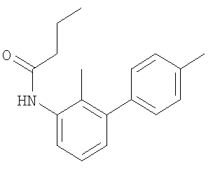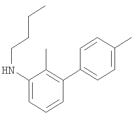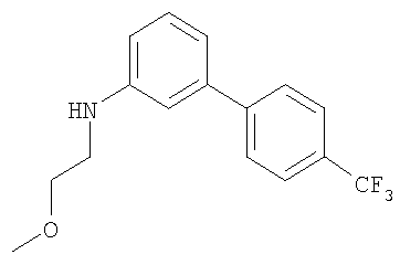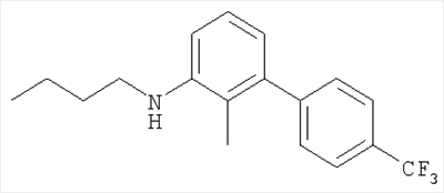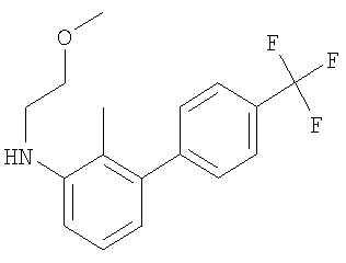 К раствору 3-бром-2-метиланилина (1,19 г; 6,4 ммоль) в DME (30 мл) и воде (15 мл) добавляли пара-трифторметилфенилбороновую кислоту (1,82 г; 9,6 ммоль) и карбонат натрия (1,76 г; 16,6 ммоль). Аппарат заполняли азотом перед добавлением тетракис(трифенилфосфин)палладия(0) (0,22 г; 0,19 ммоль). Полученную смесь нагревали до кипения с обратным холодильником и перемешивали в атмосфере азота в течение 17 ч, затем оставляли охлаждаться до комнатной температуры и растворители удаляли под вакуумом. Остаток распределяли между EtOAc (2 х 60 мл) и водой (60 мл). Органический раствор сушили (MgSO4) и растворитель удаляли под вакуумом. В результате очистки Biotage LC/MS: m/z 252,2 [M+H]+; m/z 293,3 [M+CH3CN]+, Rt 3,6 мин. Промежуточное соединение 30: N-бутил-N-[2-метил-4 К раствору 2-метил-4 LC/MS: m/z 308 [М+Н]+, Rt 4,3 мин. Промежуточное соединение 31: N-(2-метоксиэтил)-2-метил-4