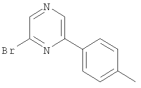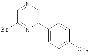 К смеси 2,6-дихлорпиразина (3 г; 20 ммоль), карбоната натрия (5,55 г; 52 ммоль) и 4-метилфенилбороновой кислоты (2,74 г; 20 ммоль) в диметоксиэтане (90 мл) и воде (45 мл) в атмосфере азота добавляли тетракис(трифенилфосфин)палладий(0) (0,46 г). Полученную смесь нагревали с обратным холодильником в течение 18 ч в атмосфере азота. После охлаждения до комнатной температуры реакционную смесь разбавляли водой (100 мл) и экстрагировали хлороформом (2×150 мл). Органический раствор сушили (MgSO4) и растворители удаляли под вакуумом. В результате очистки Biotage LC/MS: m/z 205,1 [М+Н]+, Rt 3,4 мин. Промежуточное соединение 51: 2-бром-6-[4-(трифторметил)фенил]-пиразин
