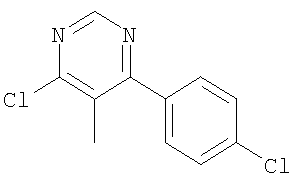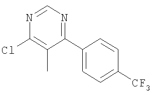 К раствору 4,6-дихлор-5-метилпиримидина (1 г; 6,13 ммоль) в диметоксиэтане (28 мл) и воде (14 мл) добавляли карбонат натрия (1,69 г; 16,0 ммоль), 4-трифторметилфенилбороновую кислоту (1,165 г; 6,13 ммоль) и тетракис(трифенилфосфин)палладий(0) (0,14 г). Полученную смесь нагревали с обратным холодильником в атмосфере азота в течение 18 ч, реакционную смесь оставляли охлаждаться до комнатной температуры и разбавляли водой (100 мл), затем экстрагировали в CHCl3 (2×100 мл). Органический раствор разделяли с помощью гидрофобной фритты и растворители удаляли под вакуумом. В результате очистки Biotage LC/MS: m/z 273,1 [M+H]+, Rt 3,3 мин. Промежуточное соединение 63: 4-хлор-6-(4-хлорфенил)-5-метилпиримидин