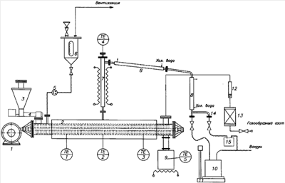 Исходя из вышеизложенного, новый процесс осуществляют следующим образом. Устройство непрерывного синтеза сырца трифторметансульфокислоты, состоящее из (см. чертеж): электродвигателя (1), реактора синтеза (2), оборудованного тремя зонами электрообогрева, загрузочного бункера (3), шнека загрузки (4), насоса-дозатора (5), мерника (6), колонки (7), заполненной силикагелем и оборудованной электрообогревом, конденсаторов-холодильников (8), приемного бункера (9), снабженного электрообогревом, приемной емкости сырой ТФМСК (10), весов (11), ротаметра (12), адсорбера (13), пробоотборного патрубка (14) и пробоотборной емкости (15), готовят к работе. Включают обогрев реактора (2), приемного бункера (9), колонки (7) и устанавливают следующие температуры по зонам реактора 230-260°С (максимальную температуру устанавливают в средней зоне), колонки (7) 150-180°С, приемного бункера (9) 240-250°С. В загрузочный бункер (3) загружают предварительно просушенный и размолотый трифлат бария и силикагель. В мерник (6) заливают моногидрат серной кислоты с содержанием основного вещества не менее 99,6% масс. Включают электродвигатель (1), вращающий через редуктор лопастной шнек реактора (2), и устанавливают заданную частоту вращения вала шнека. В реактор (2) через ротаметр (12) и адсорбер с алюмогелем (13) подают сжатый азот с расходом 10-100 л/ч. При помощи вакуумного насоса в реакторе (2), приемном бункере (9), колонке (7), конденсаторах-теплообменниках (8) и приемной емкости (10) создают абсолютное давление 550-600 мм рт.ст. Подают на проток холодную воду в конденсаторы-теплообменники (8). Включают шнек загрузки (4) и устанавливают заданный расход трифлата бария в реактор (2). Включают насос-дозатор (5) и устанавливают заданный расход моногидрата серной кислоты.