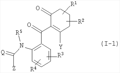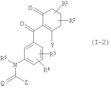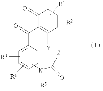 в которой Q представляет собой О (кислород) или S (серу), R1 представляет собой водород, алкил с 1-6 атомами углерода, R2 представляет собой водород, алкил с 1-6 атомами углерода, или вместе с R1 представляет алкандиил с 2-5 атомами углерода, R3 представляет собой галоген, галогеном замещенный алкил, содержащий до 4 атомов углерода, алкокси, содержащий до 4 атомов углерода, R4 представляет собой водород, галоген, R5 представляет собой водород, алкил с 1-6 атомомами углерода, Z представляет собой амино, алкиламино, при необходимости замещенный алкокси с 1-4 атомами углерода, алкоксиамино соответственно с 1-6 атомами углерода в алкильных группах; диалкиламино, N-алкилалкоксиамино или диалкилгидразино соответственно с 1-4 атомами углерода в алкильных группах; циклоалкиламино с 3-6 атомами углерода в циклоалкильной группе; замещенный галогеном фенил; арилалкиламино с 6 атомами углерода в арильной группе и с 1-4 атомами углерода в алкильной части; соответственно при необходимости алкилом с 1-4 атомами углерода, галогеналкилом с 1-4 атомами углерода, циклоалкилом с 3-6 атомами углерода замещенный гетероциклил, гетероциклиламино, -N=(гетероциклил) из ряда фурил, тетрагидрофурилметиламино, тиенил, пирролидинил, пирролидиниламино, оксоимидазолинил, изоксазолил, ди-гидроизоксазолил (изоксазолинил), тетрагидроизоксазолил (изоксазолидинил), тетрагидро-(2Н)-1,2-оксазин-2-ил, дигидротиазолил (тиазолинил), тиадиазолиламино, пиперидинил, пиперидиниламино, морфолинил, пиперазинил, 2-оксо-1,3-диазациклогексил, оксотетразолинилметил, включая их все возможными таутомерными формами и возможными солями. Новые замещенные бензоилциклогексеноны общей формулы (I), которые относятся к категории малотоксичных веществ, получают, если циклогександионы («гидроксициклогексеноны») общей формулы (II)