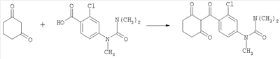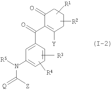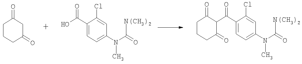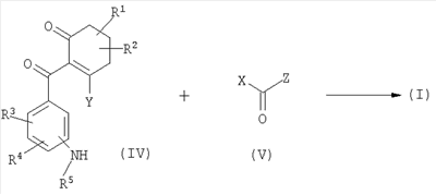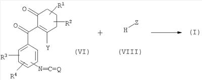 в которой Q, R3, R4, R5 и Z имеют вышеуказанные значения, или с их реакционноспособными производными, например такими, как соответствующие хлорангидриды кислот, ангидриды кислот, цианиды кислот или сложные эфиры, при необходимости, в присутствии дегидратирующего агента, при необходимости, в присутствии одного или нескольких реакционных вспомогательных агентов и, при необходимости, в присутствии одного или нескольких разбавителей, и при необходимости, сразу после этого с полученными таким образом соединениями общей формулы (I) в рамках определения заместителей обычным образом проводят электрофильные или нуклеофильные реакции замещения или реакции окисления или восстановления, или соединения общей формулы (I) обычным образом переводят в соли. Новые замещенные бензоилциклогексеноны общей формулы (I) принципиально могут быть получены также, как схематически представлено ниже. Осуществляют взаимодействие аминобензоилциклогексенонов общей формулы (IV) с галоген(тио)карбонильными соединениями общей формулы (V) или, при необходимости, с соответствующими изи(тио)цианатами (Q, R1, R2, R3, R4, R5, Y и Z имеют при этом вышеуказанные значения, Х представляет собой галоген): Соединения, используемые при заявляемых способах ( Исходные вещества формулы (V) являются известными соединениями. Исходные вещества формулы (IV) могут быть получены по известным методам. Осуществляют взаимодействие изо(тио)цианатобензоилциклогексенонов общей формулы (VI) с нуклеофильными соединениями общей формулы (VII); (Q, R1, R2, R3, R4, Y и Z имеют при этом вышеуказанные значения): Если, например, в качестве исходных веществ используют циклогексан-1,3-дион и 2-хлор-4-[(диметиламинокарбонил-метиламино)]-бензойную кислоту, то течение реакции при заявляемом способе может быть представлено следующей схемой: Исходные вещества общей формулы (II) известны и/или могут быть получены по известным методам. Исходные вещества общей формулы (III) известны и/или могут быть получены по известным методам (смотри японскую заявку на патент JP-A-11292849, примеры получения). Замещенные бензойные кислоты общей формулы (III) получают, если эфир бензойной кислоты общей формулы (IIIa)