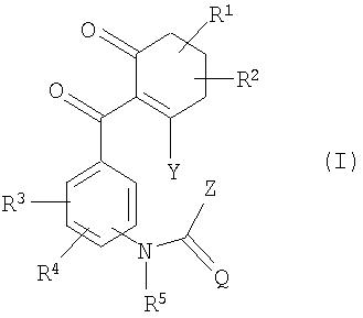 в которой Q представляет собой О (кислород) или S (серу), R1 представляет собой водород, алкил с 1-6 атомами углерода, R2 представляет собой водород, алкил с 1-6 атомами углерода, или вместе с R1 представляет алкандиил с 2-5 атомами углерода, R3 представляет собой галоген, галогеном замещенный алкил, содержащий до 4 атомов углерода, алкокси, содержащий до 4 атомов углерода, R4 представляет собой водород, галоген, R5 представляет собой водород, алкил с 1-6 атомами углерода, Y представляет собой гидрокси, Z представляет собой амино, алкиламино, при необходимости замещенный алкокси с 1-4 атомами углерода, алкоксиамино, соответственно, с 1-6 атомами углерода в алкильных группах; диалкиламино, N-алкилалкоксиамино или диалкилгидразино, соответственно с 1-4 атомами углерода в алкильных группах; циклоалкиламино с 3-6 атомами углерода в циклоалкильной группе; замещенный галогеном фенил; арилалкиламино с 6 атомами углерода в арильной группе и с 1-4 атомами углерода в алкильной части; соответственно, при необходимости алкилом с 1-4 атомами углерода, галогеналкилом с 1-4 атомами углерода, циклоалкилом с 3-6 атомами углерода замещенный гетероциклил, гетероциклиламино, -N=(гетероциклил) из ряда фурил, тетрагидрофурилметиламино, тиенил, пирролидинил, пирролидиниламино, оксоимидазолинил, изоксазолил, дигидроизоксазолил (изоксазолинил), тетрагидроизоксазолил (изоксазолидинил), тетрагидро-(2Н)-1,2-оксазин-2-ил, дигидротиазолил (тиазолинил), тиадиазолиламино, пиперидинил, пиперидиниламино, морфолинил, пиперазинил, 2-оксо-1,3-диаза-циклогексил, оксотетразолинилметил, включая их все возможные таутомерные формы и возможные соли. 2. Замещенные бензоилциклогексеноны по п.1, имеющие формулу
