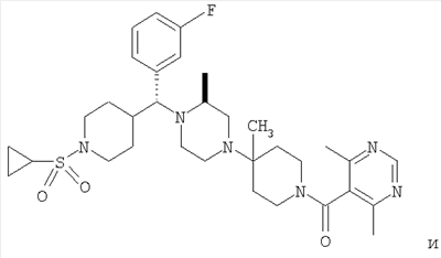9. Фармацевтическая композиция, обладающая свойствами антагониста CCR5, содержащая активное вещество на основе производного пиперидина и фармацевтически приемлемый носитель, отличающаяся тем, что в качестве производного пиперидина содержит соединение по п.1 в эффективном количестве.