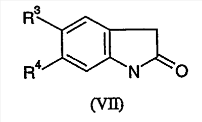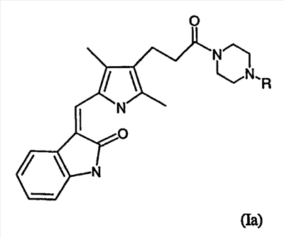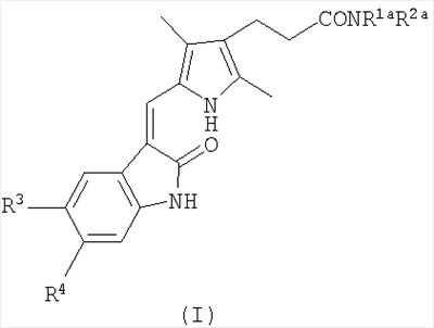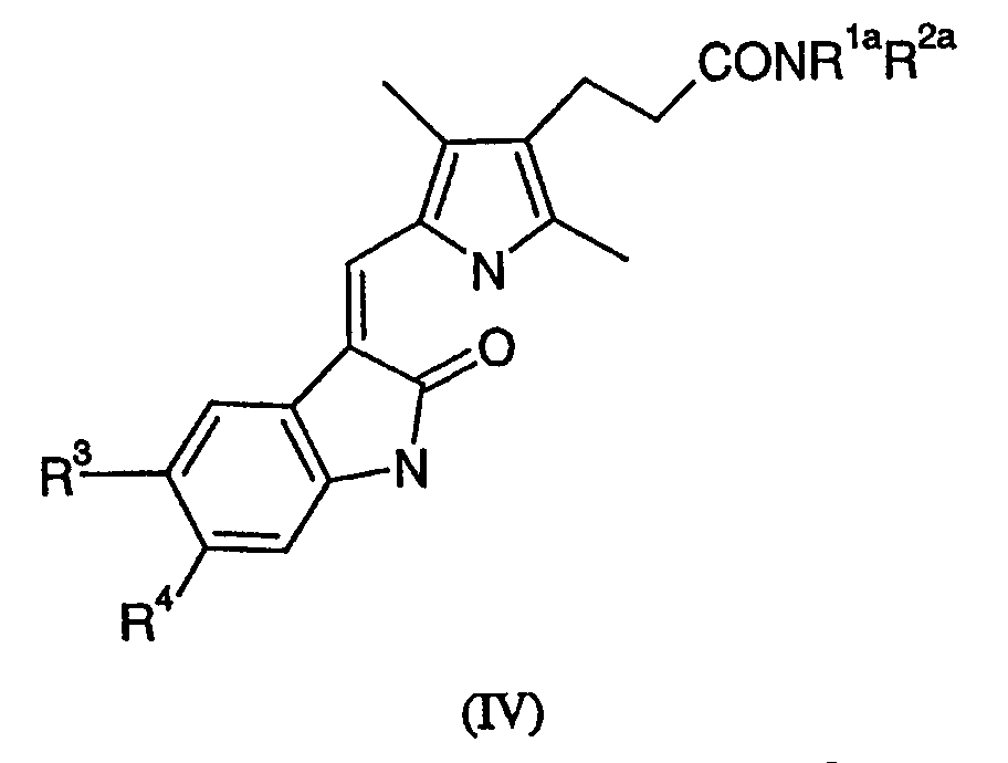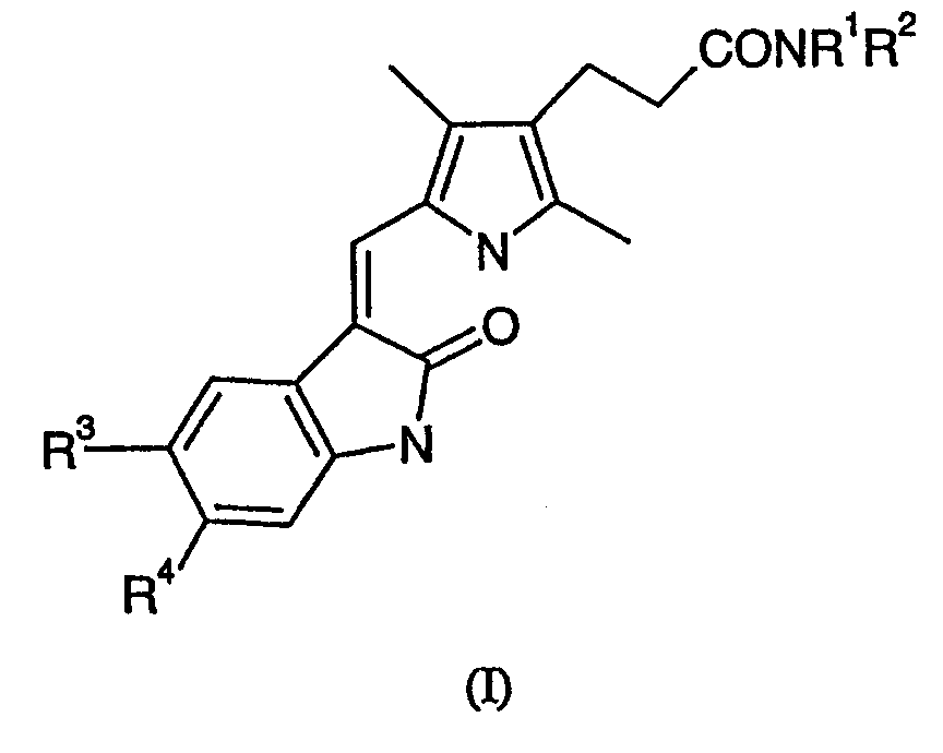 где (i) R1 представляет атом водорода или (1-4С)алкильную группу; и R2 представляет группу формулы -A1-NR5R6, в которой каждый из заместителей R5 и R6 независимо представляет атом водорода или (1-4С)алкильную группу, и А1 представляет (СН2)m, (СН2)n-А2-(СН2)p или (CH2CH2O)qCH2CH2, где m равно целому числу от 2 до 10, и каждое из n и p равно целому числу от 1 до 6, А2 представляет СН=СН, фенилен, бифенилен, циклогексилен или пиперазинилен, и q равно 1, 2 или 3; (ii) R1 и R2 вместе представляют -A3-NR7-А4, где каждый из А3 и А4 независимо представляют (СН2)r или (CH2CH2O)sCH2CH2, где r равно целому числу от 2 до 6, s равно 1, 2 или 3, и R7 представляет атом водорода или (1-4С)алкильную группу; (iii) R1 и R2 вместе с атомом азота, к которому они присоединены, представляют пиперидинильную группу, где пиперидинильная группа содержит заместитель формулы -A5-R8 в положении 4, в которой А5 представляет (1-4С)алкилен, и R8 представляет пиперидин-4-ил; или (iv) R1 и R2 вместе с атомом азота, к которому они присоединены, представляют пиперидинильную группу; и каждый из R3 и R4 независимо представляет атом водорода; или его фармацевтически приемлемая соль. 2. Соединение по п.1, где (i) R1 представляет метильную группу; и R2 представляет группу формулы -A1-NR5R6, в которой заместитель R5 представляет атом водорода, R6 представляет метильную группу, и А1 представляет (СН2)m, где m равно 2, 3, 4, 5, 6, 7, 8, 9 или 10; (СН2)n-А2-(СН2)p, где каждый из n и p равно 1, А2 представляет СН=СН, фенил-1,3-ен, фенил-1,4-ен, бифенил-2,2 (ii) R1 и R2 вместе представляют -(CH2)2-NH-(CH2)2-, -(CH2)2-N(CH3)-(СН2)2-, -(CH2)2-N(CH2CH3)-(CH2)2-, -(CH2)2-NH-(CH2)3– или -(CH2CH2O)2CH2CH2-NH-(CH2CH2O)CH2CH2-; или (iii) R1 и R2 вместе с атомом азота, к которому они присоединены, представляют пиперидинильную группу, где пиперидинильная группа содержит заместитель формулы -A5-R8 в положении 4, в которой А представляет пропилен, и R8 представляет пиперидин-4-ил. 3. Соединение по п.1, в котором (i) R1 представляет метильную группу; и R2 представляет группу формулы -A1-NHCH3, в которой А1 представляет (СН2)m, СН2СН=СНСН2, СН2-фенилен-СН2 или СН2-циклогексилен-СН2, где m равно целому числу от 2 до 8; или (ii) R1 и R2 вместе представляют -(CH2)2-NH-(CH2)2-, -(CH2)2-N(CH3)-(СН2)2-, -(CH2)2-N(CH2CH3)-(CH2)2– или -(CH2)2-NH-(CH2)3-; и R3 и R4, каждый независимо представляет атом водорода. 4. Соединение по п.3, в котором (i) R1 представляет метильную группу; и R2 представляет группу формулы -А1-NHCH3, в которой А1 представляет (СН2)m, СН2СН=СНСН2 или СН2-(1,4-фенилен)-СН2, где m равно 2 или 3; или (ii) R1 и R2 вместе представляют -(CH2)2-NH-(CH2)2-, -(CH2)2-N(CH3)-(СН2)2-, -(CH2)2-N(CH2CH3)-(CH2)2– или -(CH2)2-NH-(CH2)3-. 5. Соединение по п.1, выбранное из 3-[3,5-диметил-4-(3-оксо-3-пиперазин-1-илпропил)-1Н-пиррол-2-илметилен]-1,3-дигидроиндол-2-она; 3-[3,5-диметил-4-[3-оксо-3-(4-этил)пиперазин-1-илпропил]-1Н-пиррол-2-илметилен]-1,3-дигидроиндол-2-она; 3-[3,5-диметил-4-(3-оксо-3-гомопиперазин-1-илпропил)-1Н-пиррол-2-илметилен]-1,3-дигидроиндол-2-она; и их фармацевтически приемлемых солей. 6. Соединение по п.1, которое является соединением формулы (Ia)