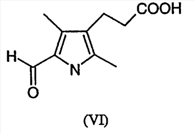 Типичная методика: компоненты тщательно смешивают и рН доводят до 4±0,5, используя HCl (0,5N) или NaOH (0,5N). Примеры синтеза Следующие примеры синтезов приведены для иллюстрации изобретения и никоим образом не должны рассматриваться как ограничивающие объем изобретения. Общая часть Используемые реагенты и растворители получены от коммерческих поставщиков, если не указано иное. Все реакции проводят при комнатной температуре и без изоляции от окружающей атмосферы, если не указано иное. Масс-спектры ионного распыления (IS-МС) получены с помощью масс-спектрометра PE Sciex API150EX. Спектры ядерного магнитного резонанса (ЯМР) записаны при 300 МГц. Химический сдвиг в слабом поле ( Получение промежуточных соединений Промежуточное соединение 1 2-Карбоксиэтил-3,5-диметил-1Н-пиррол-4-карбоновая кислота. Диэтиловый эфир 3,5-диметил-2,4-пирролдикарбоновой кислоты (200 г, 836 ммоль) помещают в химический стакан объемом 1 л и обрабатывают 400 мл концентрированной серной кислоты (H2SO4). Смесь перемешивают, нагревают до 45°С с помощью тепловой пушки и затем выдерживают 25 минут при 36-42°С. Реакционную смесь выливают в 3 л колотого льда и перемешивают в течение 30 минут. Желтое твердое вещество выделяют фильтрованием и промывают 200 мл воды. Твердое вещество переносят в 4 л колбу Эрленмейера и обрабатывают 2 л 1N раствора гидроксида натрия (NaOH), затем 100 мл 10N NaOH. Основную смесь фильтруют и желтый твердый остаток отбрасывают. Фильтрат подкисляют H2SO4. Получившиеся в результате твердое вещество выделяют вакуумным фильтрованием и промывают 2×500 мл воды. После аспирационной сушки соединение помещают в 6 л колбу Эрленмейера и кипятят непродолжительное время в 4 л ацетона. После ночи стояния при комнатной температуре (КТ) твердое вещество отделяют фильтрованием и сушат в вакуумном эксикаторе с получением 139 г, 659 ммоль, 79% указанного в заголовке соединения. 1Н ЯМР (ДМСО-d6) Промежуточное соединение 2 2-Карбоксиэтил-3,5-диметил-1Н-пиррол Промежуточное соединение 1 (137 г, 650 ммоль) помещают в 500 мл колбу Эрленмейера и обрабатывают этаноламином (80 г, 1,3 моль). Затем смесь нагревают до 220°С греющей рубашкой, спустя приблизительно 30 минут образуется коричневый раствор, к этому времени выделение газа почти заканчивается. Реакционную смесь нагревают еще 30 минут, затем выливают в 2 л ледяной воды. Неочищенный продукт выделяют вакуумным фильтрованием и затем кипятят в 700 мл 95% этанола (EtOH). Смесь фильтруют в горячем виде, фильтрат медленно охлаждают до КТ и затем до -20°С. Образовавшиеся кристаллы выделяют вакуумным фильтрованием и сушат в вакуумном эксикаторе с получением 75,6 г, 453 ммоль, 70% указанного в заголовке соединения. 1Н ЯМР (ДМСО-d6) Промежуточное соединение 3 2-Карбоксиэтил-3,5-диметил-1Н-пиррол-4-карбоксальдегид Промежуточное соединение 2 (75,6г, 453 ммоль) помещают в сухую трехгорлую круглодонную колбу емкостью 1 л. Твердое вещество обрабатывают безводным N,N-диметилформамидом (ДМФА, 43,8 мл, 566 ммоль). Колбу встряхивают, пока ДМФА не распределится во всей массе твердого вещества. Колбу охлаждают на ледяной бане и к смеси в течение 30 минут через капельную воронку добавляют оксихлорид фосфора (POCl3, 52,7 мл, 566 ммоль). Колбу встряхивают до полного распределения реагентов. Затем колбу погружают на масляную баню с температурой 100°С и нагревают при перемешивании магнитной мешалкой в течение 6 часов. Образовавшуюся глубок